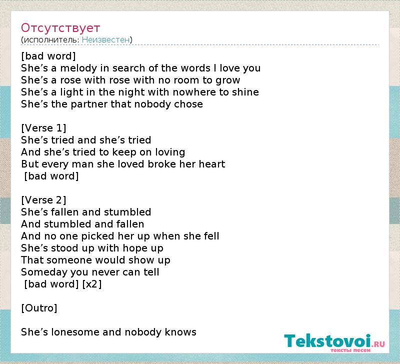 [bad word] She’s a melody in search of the words I love you She’s a rose with rose with no room to grow She’s a light in the night with nowhere to shine She’s the partner that nobody chose [Verse 1] She’s tried and she’s tried And she’s tried to keep on loving But every man she loved broke her heart [bad word] [Verse 2] She’s fallen and stumbled And stumbled and fallen And no one picked her up when she fell She’s stood up with hope up That someone would show up Someday you never can tell [bad word] [x2] [Outro] She’s lonesome and nobody knows