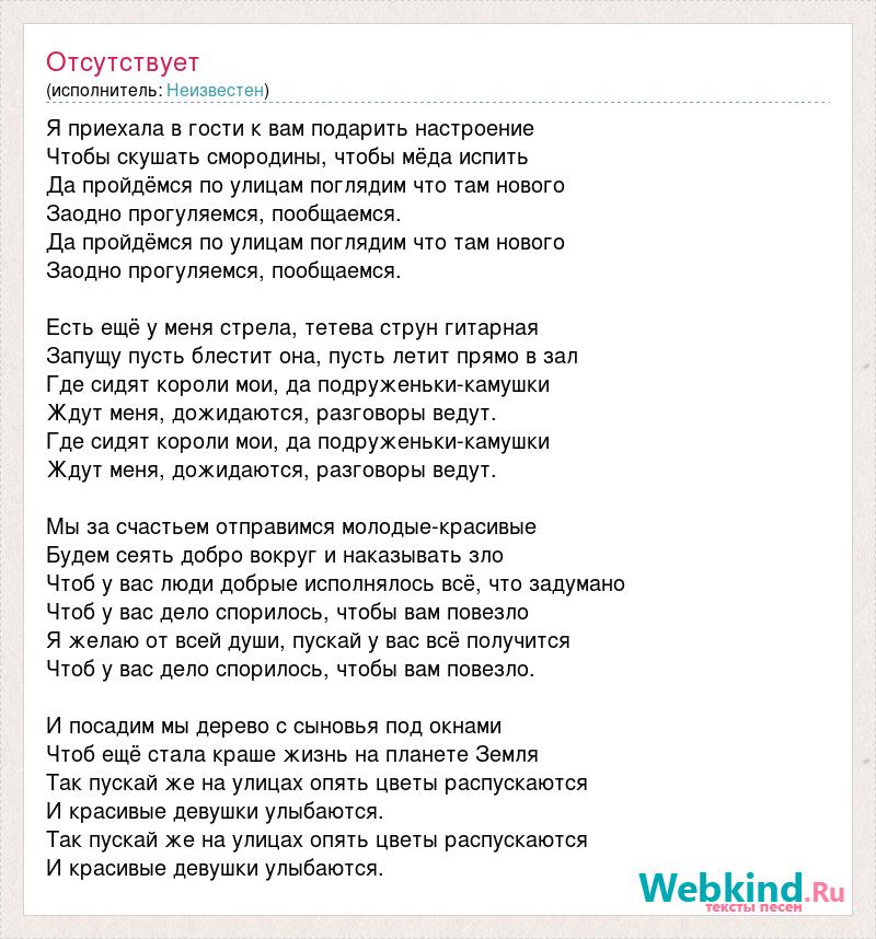 Я приехала в гости к вам подарить настроение Чтобы скушать смородины, чтобы мёда испить Да пройдёмся по улицам поглядим что там нового Заодно прогуляемся, пообщаемся. Да пройдёмся по улицам поглядим что там нового Заодно прогуляемся, пообщаемся. Есть ещё у меня стрела, тетева струн гитарная Запущу пусть блестит она, пусть летит прямо в зал Где сидят короли мои, да подруженьки-камушки Ждут меня, дожидаются, разговоры ведут. Где сидят короли мои, да подруженьки-камушки Ждут меня, дожидаются, разговоры ведут. Мы за счастьем отправимся молодые-красивые Будем сеять добро вокруг и наказывать зло Чтоб у вас люди добрые исполнялось всё, что задумано Чтоб у вас дело спорилось, чтобы вам повезло Я желаю от всей души, пускай у вас всё получится Чтоб у вас дело спорилось, чтобы вам повезло. И посадим мы дерево с сыновья под окнами Чтоб ещё стала краше жизнь на планете Земля Так пускай же на улицах опять цветы распускаются И красивые девушки улыбаются. Так пускай же на улицах опять цветы распускаются И красивые девушки улыбаются.