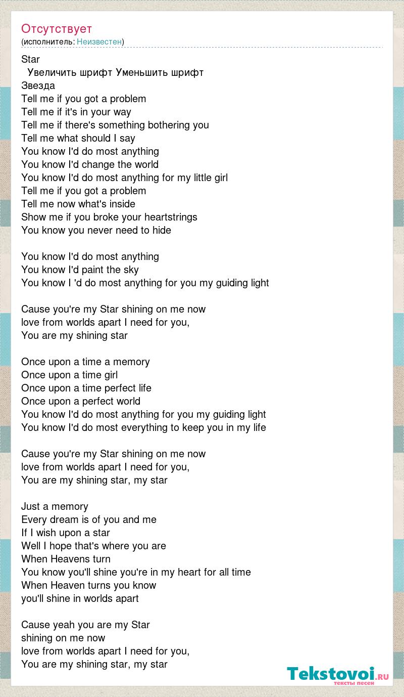 Star Увеличить шрифт Уменьшить шрифт Звезда Tell me if you got a problem Tell me if it's in your way Tell me if there's something bothering you Tell me what should I say You know I'd do most anything You know I'd change the world You know I'd do most anything for my little girl Tell me if you got a problem Tell me now what's inside Show me if you broke your heartstrings You know you never need to hide You know I'd do most anything You know I'd paint the sky You know I 'd do most anything for you my guiding light Cause you're my Star shining on me now love from worlds apart I need for you, You are my shining star Once upon a time a memory Once upon a time girl Once upon a time perfect life Once upon a perfect world You know I'd do most anything for you my guiding light You know I'd do most everything to keep you in my life Cause you're my Star shining on me now love from worlds apart I need for you, You are my shining star, my star Just a memory Every dream is of you and me If I wish upon a star Well I hope that's where you are When Heavens turn You know you'll shine you're in my heart for all time When Heaven turns you know you'll shine in worlds apart Cause yeah you are my Star shining on me now love from worlds apart I need for you, You are my shining star, my star
