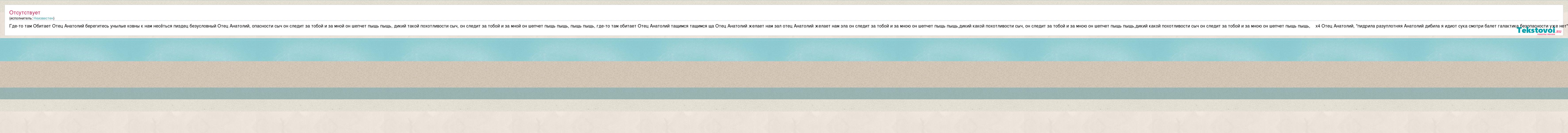 Где-то там Обитает Отец Анатолий берегитесь унылые ковны к нам несёться пиздец безусловный Отец Анатолий, опасности сыч он следит за тобой и за мной он шепчет пыщь пыщь, дикий такой похотливости сыч, он следит за тобой и за мной он шепчет пыщь пыщь, пыщь пыщь, где-то там обитает Отец Анатолий тащимся тащимся ща Отец Анатолий желает нам зал отец Анатолий желает нам зла он следит за тобой и за мною он шепчет пыщь пыщь,дикий какой похотливости сыч, он следит за тобой и за мною он шепчет пыщь пыщь,дикий какой похотливости сыч он следит за тобой и за мною он шепчет пыщь пыщь, х4 Отец Анатолий, "пидрила разуплотняя Анатолий дибила я идиот сука смотри балет галактика безопасности уже нет"