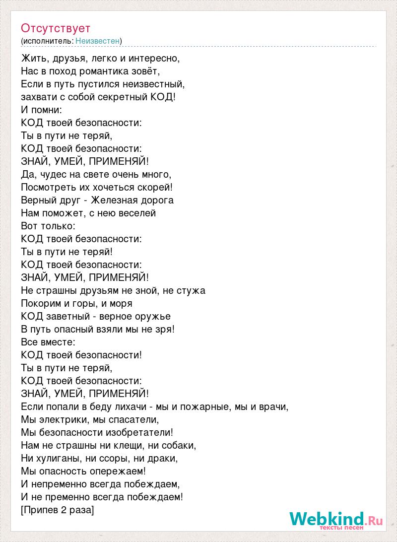 Жить, друзья, легко и интересно, Нас в поход романтика зовёт, Если в путь пустился неизвестный, захвати с собой секретный КОД! И помни: КОД твоей безопасности: Ты в пути не теряй, КОД твоей безопасности: ЗНАЙ, УМЕЙ, ПРИМЕНЯЙ! Да, чудес на свете очень много, Посмотреть их хочеться скорей! Верный друг - Железная дорога Нам поможет, с нею веселей Вот только: КОД твоей безопасности: Ты в пути не теряй! КОД твоей безопасности: ЗНАЙ, УМЕЙ, ПРИМЕНЯЙ! Не страшны друзьям не зной, не стужа Покорим и горы, и моря КОД заветный - верное оружье В путь опасный взяли мы не зря! Все вместе: КОД твоей безопасности! Ты в пути не теряй, КОД твоей безопасности: ЗНАЙ, УМЕЙ, ПРИМЕНЯЙ! Если попали в беду лихачи - мы и пожарные, мы и врачи, Мы электрики, мы спасатели, Мы безопасности изобретатели! Нам не страшны ни клещи, ни собаки, Ни хулиганы, ни ссоры, ни драки, Мы опасность опережаем! И непременно всегда побеждаем, И не пременно всегда побеждаем! [Припев 2 раза]