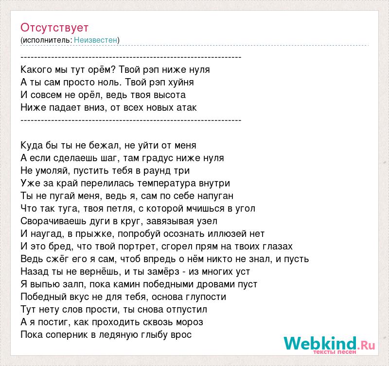 ----------------------------------------------------------------- Какого мы тут орём? Твой рэп ниже нуля А ты сам просто ноль. Твой рэп хуйня И совсем не орёл, ведь твоя высота Ниже падает вниз, от всех новых атак ----------------------------------------------------------------- Куда бы ты не бежал, не уйти от меня А если сделаешь шаг, там градус ниже нуля Не умоляй, пустить тебя в раунд три Уже за край перелилась температура внутри Ты не пугай меня, ведь я, сам по себе напуган Что так туга, твоя петля, с которой мчишься в угол Сворачиваешь дуги в круг, завязывая узел И наугад, в прыжке, попробуй осознать иллюзей нет И это бред, что твой портрет, сгорел прям на твоих глазах Ведь сжёг его я сам, чтоб впредь о нём никто не знал, и пусть Назад ты не вернёшь, и ты замёрз - из многих уст Я выпью залп, пока камин победными дровами пуст Победный вкус не для тебя, основа глупости Тут нету слов прости, ты снова отпустил А я постиг, как проходить сквозь мороз Пока соперник в ледяную глыбу врос