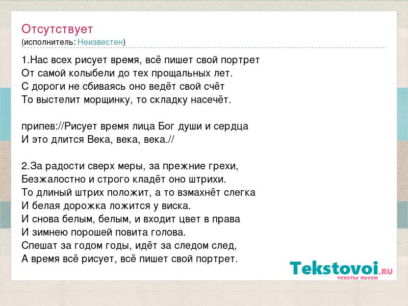 1.Нас всех рисует время, всё пишет свой портрет От самой колыбели до тех прощальных лет. С дороги не сбиваясь оно ведёт свой счёт То выстелит морщинку, то складку насечёт. припев://Рисует время лица Бог души и сердца И это длится Века, века, века.// 2.За радости сверх меры, за прежние грехи, Безжалостно и строго кладёт оно штрихи. То длиный штрих положит, а то взмахнёт слегка И белая дорожка ложится у виска. И снова белым, белым, и входит цвет в права И зимнею порошей повита голова. Спешат за годом годы, идёт за следом след, А время всё рисует, всё пишет свой портрет.