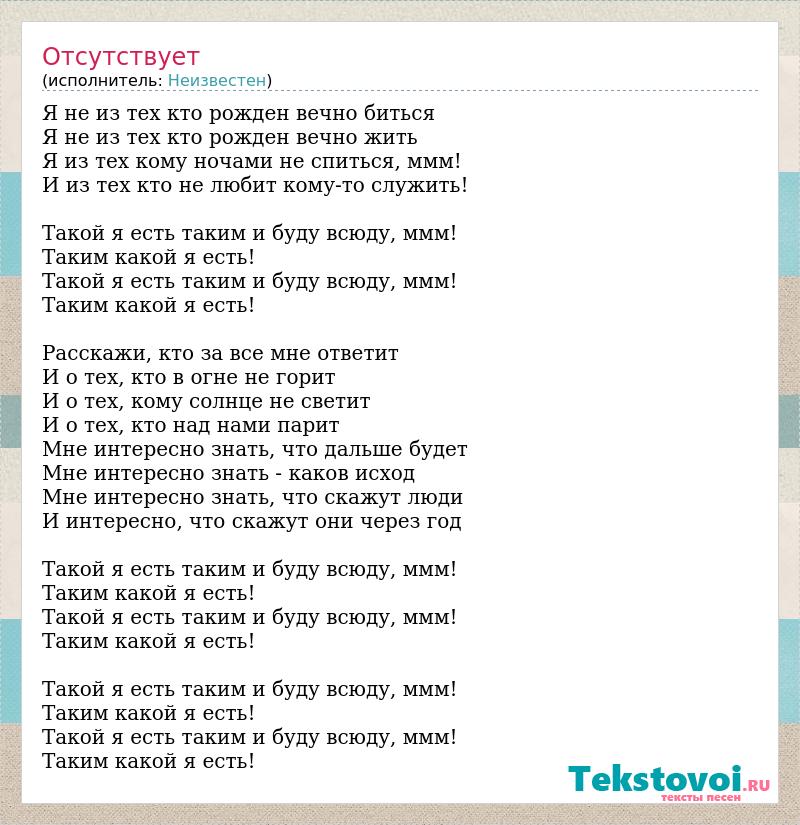 Я не из тех кто рожден вечно биться Я не из тех кто рожден вечно жить Я из тех кому ночами не спиться, ммм! И из тех кто не любит кому-то служить! Такой я есть таким и буду всюду, ммм! Таким какой я есть! Такой я есть таким и буду всюду, ммм! Таким какой я есть! Расскажи, кто за все мне ответит И о тех, кто в огне не горит И о тех, кому солнце не светит И о тех, кто над нами парит Мне интересно знать, что дальше будет Мне интересно знать - каков исход Мне интересно знать, что скажут люди И интересно, что скажут они через год Такой я есть таким и буду всюду, ммм! Таким какой я есть! Такой я есть таким и буду всюду, ммм! Таким какой я есть! Такой я есть таким и буду всюду, ммм! Таким какой я есть! Такой я есть таким и буду всюду, ммм! Таким какой я есть!