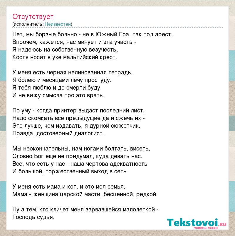 Нет, мы борзые больно - не в Южный Гоа, так под арест. Впрочем, кажется, нас минует и эта участь - Я надеюсь на собственную везучесть, Костя носит в ухе мальтийский крест. У меня есть черная нелинованная тетрадь. Я болею и месяцами лечу простуду. Я тебя люблю и до смерти буду И не вижу смысла про это врать. По уму - когда принтер выдаст последний лист, Надо скомкать все предыдущие да и сжечь их - Это лучше, чем издавать, я дурной сюжетчик. Правда, достоверный диалогист. Мы неокончательны, нам ногами болтать, висеть, Словно Бог еще не придумал, куда девать нас. Все, что есть у нас - наша чертова адекватность И большой, торжественный выход в сеть. У меня есть мама и кот, и это моя семья. Мама - женщина царской масти, бесценной, редкой. Ну а тем, кто кличет меня зарвавшейся малолеткой - Господь судья.