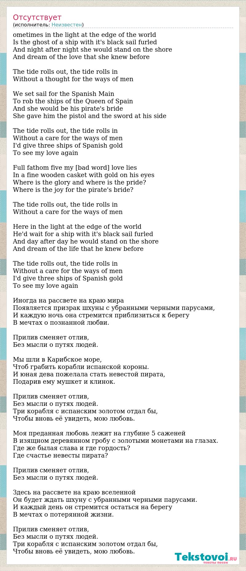 ometimes in the light at the edge of the world Is the ghost of a ship with it's black sail furled And night after night she would stand on the shore And dream of the love that she knew before The tide rolls out, the tide rolls in Without a thought for the ways of men We set sail for the Spanish Main To rob the ships of the Queen of Spain And she would be his pirate's bride She gave him the pistol and the sword at his side The tide rolls out, the tide rolls in Without a care for the ways of men I'd give three ships of Spanish gold To see my love again Full fathom five my [bad word] love lies In a fine wooden casket with gold on his eyes Where is the glory and where is the pride? Where is the joy for the pirate's bride? The tide rolls out, the tide rolls in Without a care for the ways of men Here in the light at the edge of the world He'd wait for a ship with it's black sail furled And day after day he would stand on the shore And dream of the life that he knew before The tide rolls out, the tide rolls in Without a care for the ways of men I'd give three ships of Spanish gold To see my love again Иногда на рассвете на краю мира Появляется призрак шхуны с убранными черными парусами, И каждую ночь она стремится приблизиться к берегу В мечтах о познанной любви. Прилив сменяет отлив, Без мысли о путях людей. Мы шли в Карибское море, Чтоб грабить корабли испанской короны. И юная дева пожелала стать невестой пирата, Подарив ему мушкет и клинок. Прилив сменяет отлив, Без мысли о путях людей. Три корабля с испанским золотом отдал бы, Чтобы вновь её увидеть, мою любовь. Моя преданная любовь лежит на глубине 5 саженей В изящном деревянном гробу с золотыми монетами на глазах. Где же былая слава и где гордость? Где счастье невесты пирата? Прилив сменяет отлив, Без мысли о путях людей. Здесь на рассвете на краю вселенной Он будет ждать шхуну с убранными черными парусами. И каждый день он стремится остаться на берегу В мечтах о потерянной жизни. Прилив сменяет отлив, Без мысли о путях людей. Три корабля с испанским золотом отдал бы, Чтобы вновь её увидеть, мою любовь.