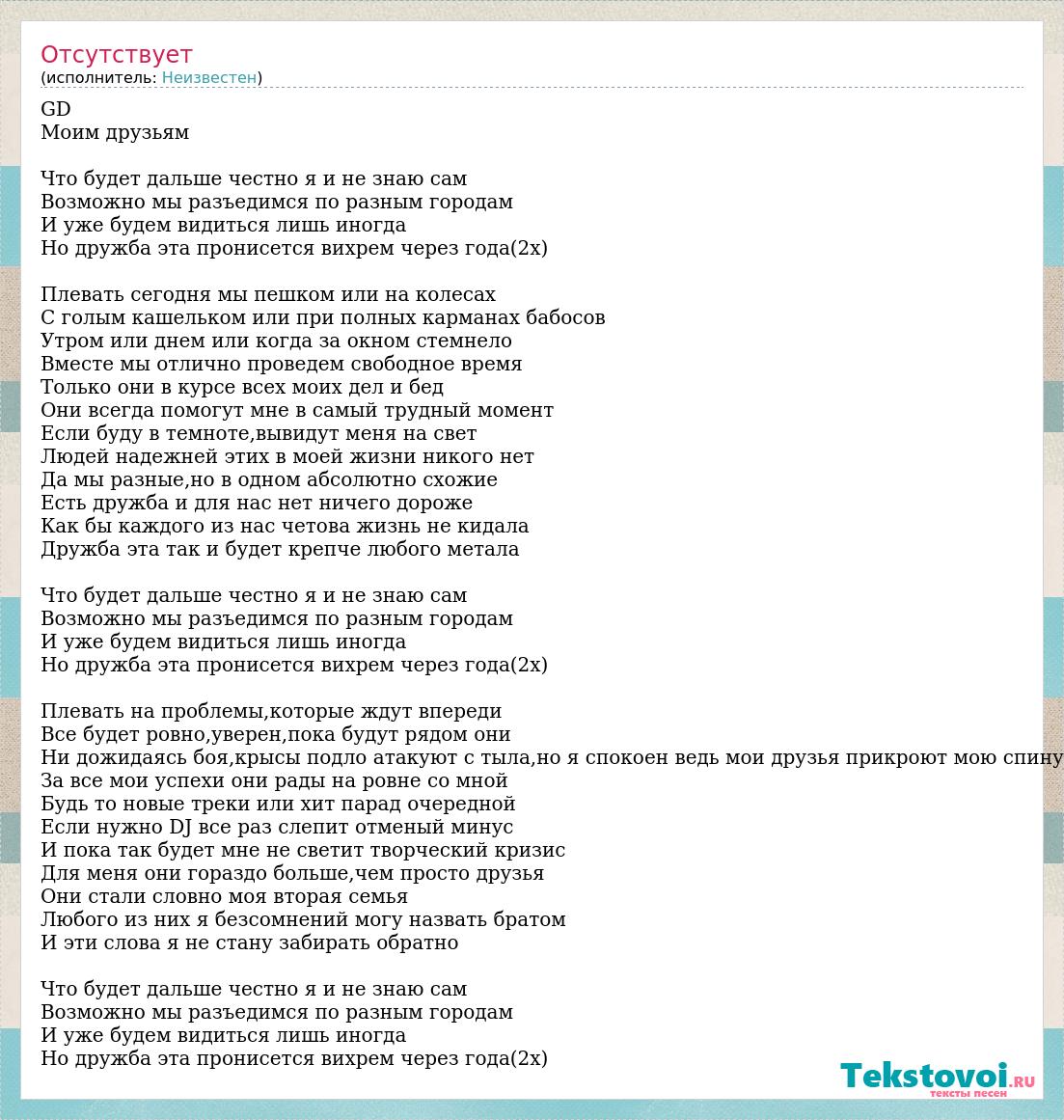GD Моим друзьям Что будет дальше честно я и не знаю сам Возможно мы разъедимся по разным городам И уже будем видиться лишь иногда Но дружба эта пронисется вихрем через года(2х) Плевать сегодня мы пешком или на колесах С голым кашельком или при полных карманах бабосов Утром или днем или когда за окном стемнело Вместе мы отлично проведем свободное время Только они в курсе всех моих дел и бед Они всегда помогут мне в самый трудный момент Если буду в темноте,вывидут меня на свет Людей надежней этих в моей жизни никого нет Да мы разные,но в одном абсолютно схожие Есть дружба и для нас нет ничего дороже Как бы каждого из нас четова жизнь не кидала Дружба эта так и будет крепче любого метала Что будет дальше честно я и не знаю сам Возможно мы разъедимся по разным городам И уже будем видиться лишь иногда Но дружба эта пронисется вихрем через года(2х) Плевать на проблемы,которые ждут впереди Все будет ровно,уверен,пока будут рядом они Ни дожидаясь боя,крысы подло атакуют с тыла,но я спокоен ведь мои друзья прикроют мою спину За все мои успехи они рады на ровне со мной Будь то новые треки или хит парад очередной Если нужно DJ все раз слепит отменый минус И пока так будет мне не светит творческий кризис Для меня они гораздо больше,чем просто друзья Они стали словно моя вторая семья Любого из них я безсомнений могу назвать братом И эти слова я не стану забирать обратно Что будет дальше честно я и не знаю сам Возможно мы разъедимся по разным городам И уже будем видиться лишь иногда Но дружба эта пронисется вихрем через года(2х)