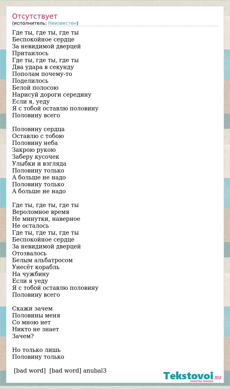 Где ты, где ты, где ты Беспокойное сердце За невидимой дверцей Притаилось Где ты, где ты, где ты Два удара в секунду Пополам почему-то Поделилось Белой полосою Нарисуй дороги середину Если я, уеду Я с тобой оставлю половину Половину всего Половину сердца Оставлю с тобою Половину неба Закрою рукою Заберу кусочек Улыбки и взгляда Половину только А больше не надо Половину только А больше не надо Где ты, где ты, где ты Вероломное время Не минутки, наверное Не осталось Где ты, где ты, где ты Беспокойное сердце За невидимой дверцей Отозвалось Белым альбатросом Унесёт корабль На чужбину Если я уеду Я с тобой оставлю половину Половину всего Скажи зачем Половины меня Со мною нет Никто не знает Зачем? Но только лишь Половину только [bad word] [bad word] anubal3