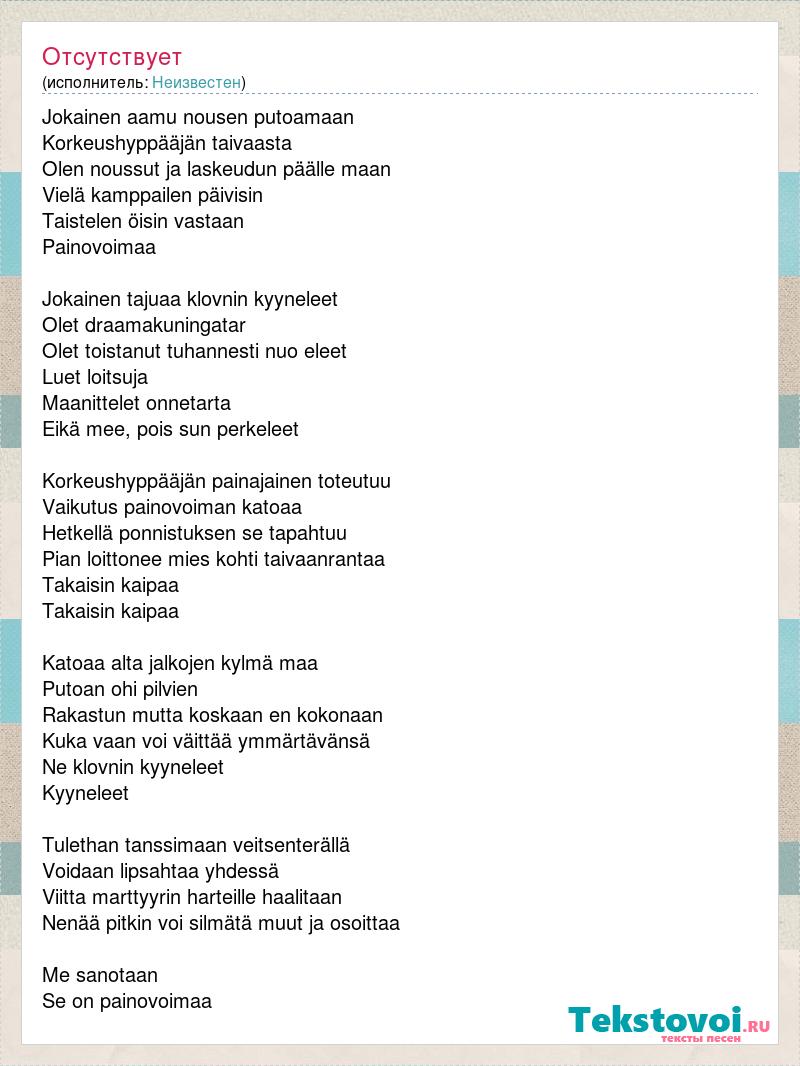 Jokainen aamu nousen putoamaan Korkeushyppääjän taivaasta Olen noussut ja laskeudun päälle maan Vielä kamppailen päivisin Taistelen öisin vastaan Painovoimaa Jokainen tajuaa klovnin kyyneleet Olet draamakuningatar Olet toistanut tuhannesti nuo eleet Luet loitsuja Maanittelet onnetarta Eikä mee, pois sun perkeleet Korkeushyppääjän painajainen toteutuu Vaikutus painovoiman katoaa Hetkellä ponnistuksen se tapahtuu Pian loittonee mies kohti taivaanrantaa Takaisin kaipaa Takaisin kaipaa Katoaa alta jalkojen kylmä maa Putoan ohi pilvien Rakastun mutta koskaan en kokonaan Kuka vaan voi väittää ymmärtävänsä Ne klovnin kyyneleet Kyyneleet Tulethan tanssimaan veitsenterällä Voidaan lipsahtaa yhdessä Viitta marttyyrin harteille haalitaan Nenää pitkin voi silmätä muut ja osoittaa Me sanotaan Se on painovoimaa