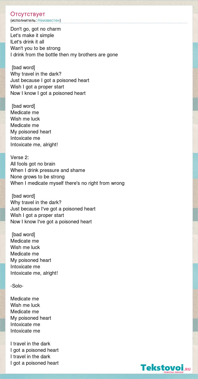 Don't go, got no charm Let's make it simple lLet's drink it all Wan't you to be strong I drink from the bottle then my brothers are gone [bad word] Why travel in the dark? Just because I got a poisoned heart Wish I got a proper start Now I know I got a poisoned heart [bad word] Medicate me Wish me luck Medicate me My poisoned heart Intoxicate me Intoxicate me, alright! Verse 2: All fools got no brain When I drink pressure and shame None grows to be strong When I medicate myself there's no right from wrong [bad word] Why travel in the dark? Just because I've got a poisoned heart Wish I got a proper start Now I know I've got a poisoned heart [bad word] Medicate me Wish me luck Medicate me My poisoned heart Intoxicate me Intoxicate me, alright! -Solo- Medicate me Wish me luck Medicate me My poisoned heart Intoxicate me Intoxicate me I travel in the dark I got a poisoned heart I travel in the dark I got a poisoned heart