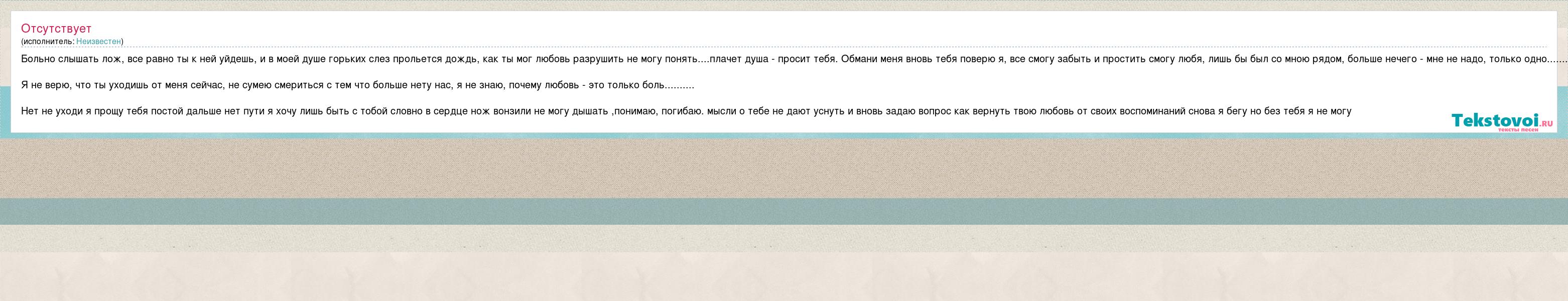 Больно слышать лож, все равно ты к ней уйдешь, и в моей душе горьких слез прольется дождь, как ты мог любовь разрушить не могу понять....плачет душа - просит тебя. Обмани меня вновь тебя поверю я, все смогу забыть и простить смогу любя, лишь бы был со мною рядом, больше нечего - мне не надо, только одно.......