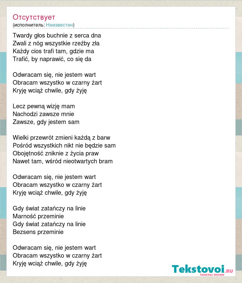 Twardy głos buchnie z serca dna Zwali z nóg wszystkie rzeźby zła Każdy cios trafi tam, gdzie ma Trafić, by naprawić, co się da Odwracam się, nie jestem wart Obracam wszystko w czarny żart Kryję wciąż chwile, gdy żyję Lecz pewną wizję mam Nachodzi zawsze mnie Zawsze, gdy jestem sam Wielki przewrót zmieni każdą z barw Pośród wszystkich nikt nie będzie sam Obojętność zniknie z życia praw Nawet tam, wśród nieotwartych bram Odwracam się, nie jestem wart Obracam wszystko w czarny żart Kryję wciąż chwile, gdy żyję Gdy świat zatańczy na linie Marność przeminie Gdy świat zatańczy na linie Bezsens przeminie Odwracam się, nie jestem wart Obracam wszystko w czarny żart Kryję wciąż chwile, gdy żyję