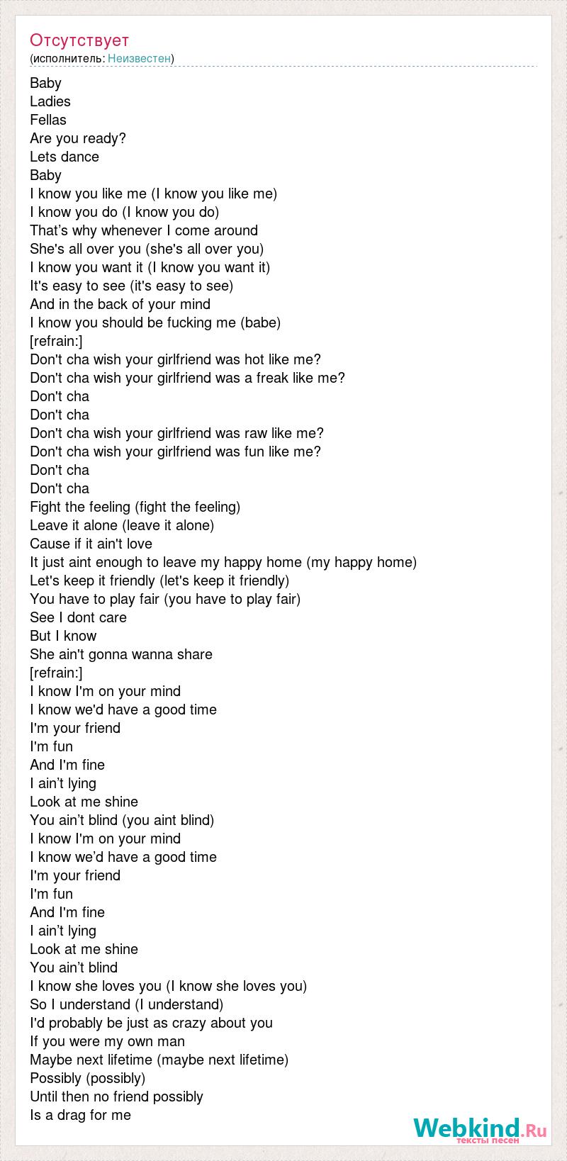 Baby Ladies Fellas Are you ready? Lets dance Baby I know you like me (I know you like me) I know you do (I know you do) That’s why whenever [bad word] around She's all over you (she's all over you) I know you want it (I know you want it) It's easy to see (it's easy to see) And in the back of your mind I know you should be [bad word] me (babe) [refrain:] Don't cha wish your girlfriend was hot like me? Don't cha wish your girlfriend was a freak like me? Don't cha Don't cha Don't cha wish your girlfriend was raw like me? Don't cha wish your girlfriend was fun like me? Don't cha Don't cha Fight the feeling (fight the feeling) Leave it alone (leave it alone) Cause if it ain't love It just aint enough to leave my happy home (my happy home) Let's keep it friendly (let's keep it friendly) You have to play fair (you have to play fair) See I dont care But I know She ain't gonna wanna share [refrain:] I know I'm on your mind I know we'd have a good time I'm your friend I'm fun And I'm fine I ain’t lying Look at me shine You ain’t blind (you aint blind) I know I'm on your mind I know we’d have a good time I'm your friend I'm fun And I'm fine I ain’t lying Look at me shine You ain’t blind I know she loves you (I know she loves you) So I understand (I understand) I'd probably be just as crazy about you If you were my own man Maybe next lifetime (maybe next lifetime) Possibly (possibly) Until then no friend possibly Is a drag for me