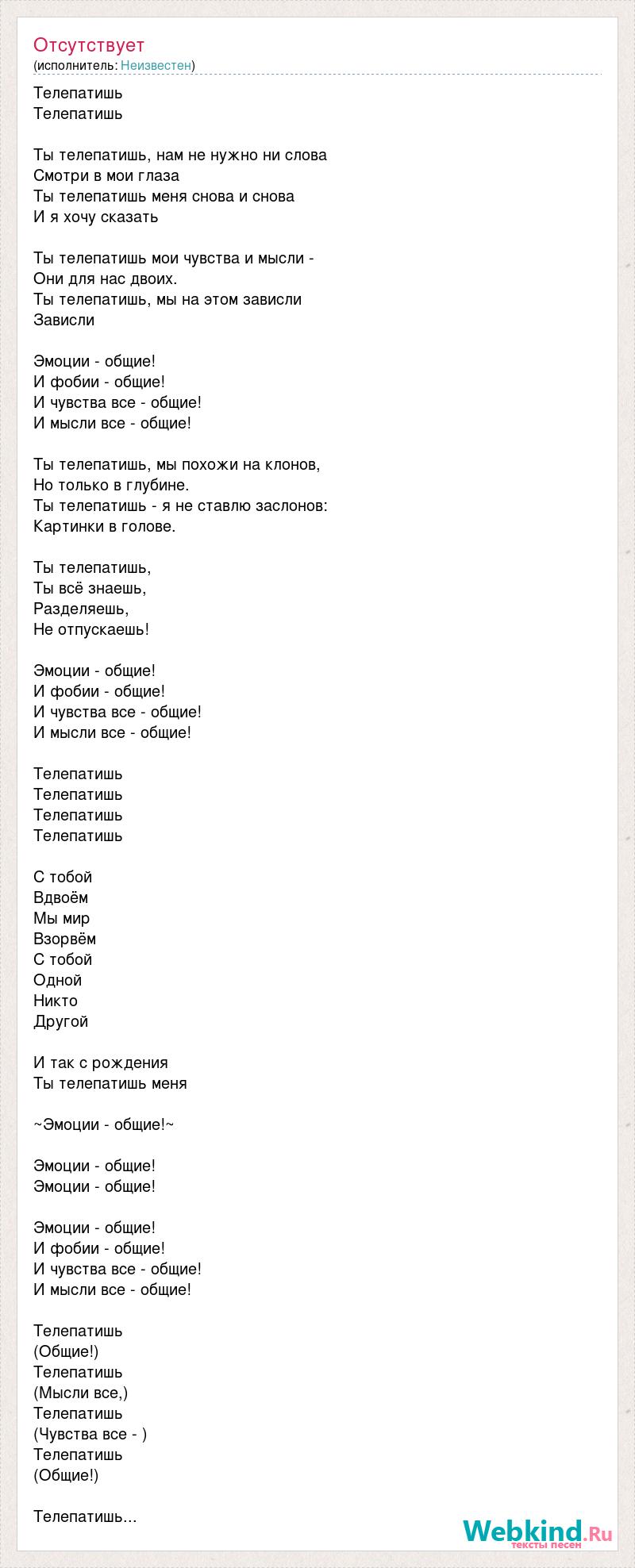 Телепатишь Телепатишь Ты телепатишь, нам не нужно ни слова Смотри в мои глаза Ты телепатишь меня снова и снова И я хочу сказать Ты телепатишь мои чувства и мысли - Они для нас двоих. Ты телепатишь, мы на этом зависли Зависли Эмоции - общие! И фобии - общие! И чувства все - общие! И мысли все - общие! Ты телепатишь, мы похожи на клонов, Но только в глубине. Ты телепатишь - я не ставлю заслонов: Картинки в голове. Ты телепатишь, Ты всё знаешь, Разделяешь, Не отпускаешь! Эмоции - общие! И фобии - общие! И чувства все - общие! И мысли все - общие! Телепатишь Телепатишь Телепатишь Телепатишь С тобой Вдвоём Мы мир Взорвём С тобой Одной Никто Другой И так с рождения Ты телепатишь меня ~Эмоции - общие!~ Эмоции - общие! Эмоции - общие! Эмоции - общие! И фобии - общие! И чувства все - общие! И мысли все - общие! Телепатишь (Общие!) Телепатишь (Мысли все,) Телепатишь (Чувства все - ) Телепатишь (Общие!) Телепатишь...