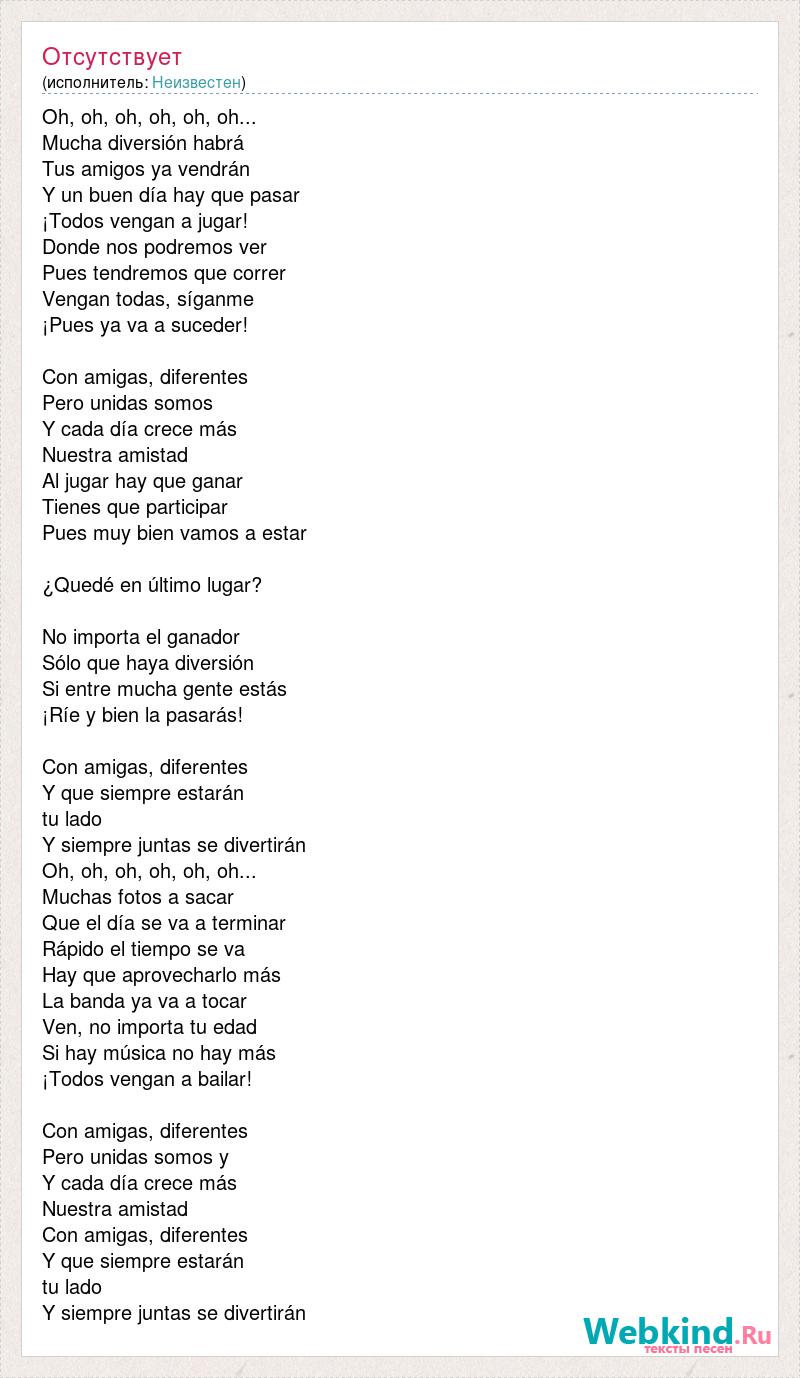 Oh, oh, oh, oh, oh, oh... Mucha diversión habrá Tus amigos ya vendrán Y un buen día hay que pasar ¡Todos vengan a jugar! Donde nos podremos ver Pues tendremos que correr Vengan todas, síganme ¡Pues ya va a suceder! Con amigas, diferentes Pero unidas somos Y cada día crece más Nuestra amistad Al jugar hay que ganar Tienes que participar Pues muy bien vamos a estar ¿Quedé en último lugar? No importa el ganador Sólo que haya diversión Si entre mucha gente estás ¡Ríe y bien la pasarás! Con amigas, diferentes Y que siempre estarán tu lado Y siempre juntas se divertirán Oh, oh, oh, oh, oh, oh... Muchas fotos a sacar Que el día se va a terminar Rápido el tiempo se va Hay que aprovecharlo más La banda ya va a tocar Ven, no importa tu edad Si hay música no hay más ¡Todos vengan a bailar! Con amigas, diferentes Pero unidas somos y Y cada día crece más Nuestra amistad Con amigas, diferentes Y que siempre estarán tu lado Y siempre juntas se divertirán