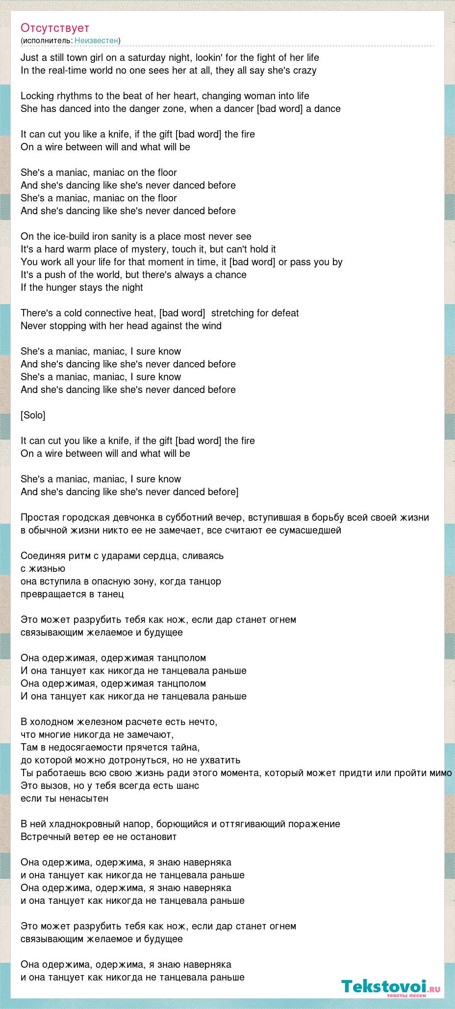 Just a still town girl on a saturday night, lookin' for the fight of her life In the real-time world no one sees her at all, they all say she's crazy Locking rhythms to the beat of her heart, changing woman into life She has danced into the danger zone, when a dancer [bad word] a dance It can cut you like a knife, if the gift [bad word] the fire On a wire between will and what will be She's a maniac, maniac on the floor And she's dancing like she's never danced before She's a maniac, maniac on the floor And she's dancing like she's never danced before On the ice-build iron sanity is a place most never see It's a hard warm place of mystery, touch it, but can't hold it You work all your life for that moment in time, it [bad word] or pass you by It's a push of the world, but there's always a chance If the hunger stays the night There's a cold connective heat, [bad word] stretching for defeat Never stopping with her head against the wind She's a maniac, maniac, I sure know And she's dancing like she's never danced before She's a maniac, maniac, I sure know And she's dancing like she's never danced before [Solo] It can cut you like a knife, if the gift [bad word] the fire On a wire between will and what will be She's a maniac, maniac, I sure know And she's dancing like she's never danced before] Простая городская девчонка в субботний вечер, вступившая в борьбу всей своей жизни в обычной жизни никто ее не замечает, все считают ее сумасшедшей Соединяя ритм с ударами сердца, сливаясь с жизнью она вступила в опасную зону, когда танцор превращается в танец Это может разрубить тебя как нож, если дар станет огнем связывающим желаемое и будущее Она одержимая, одержимая танцполом И она танцует как никогда не танцевала раньше Она одержимая, одержимая танцполом И она танцует как никогда не танцевала раньше В холодном железном расчете есть нечто, что многие никогда не замечают, Там в недосягаемости прячется тайна, до которой можно дотронуться, но не ухватить Ты работаешь всю свою жизнь ради этого момента, который может придти или пройти мимо Это вызов, но у тебя всегда есть шанс если ты ненасытен В ней хладнокровный напор, борющийся и оттягивающий поражение Встречный ветер ее не остановит Она одержима, одержима, я знаю наверняка и она танцует как никогда не танцевала раньше Она одержима, одержима, я знаю наверняка и она танцует как никогда не танцевала раньше Это может разрубить тебя как нож, если дар станет огнем связывающим желаемое и будущее Она одержима, одержима, я знаю наверняка и она танцует как никогда не танцевала раньше