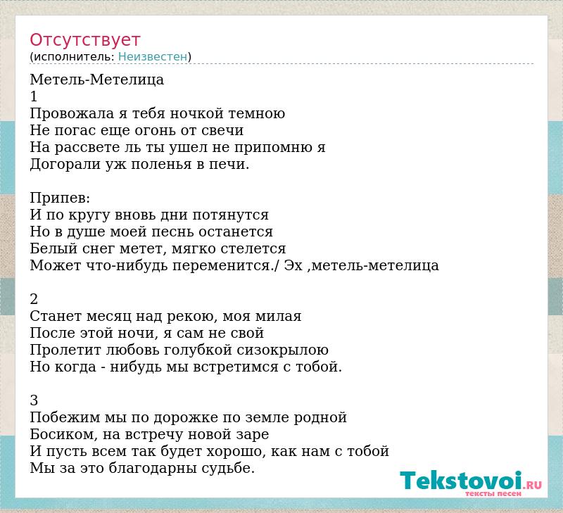 Метель-Метелица 1 Провожала я тебя ночкой темною Не погас еще огонь от свечи На рассвете ль ты ушел не припомню я Догорали уж поленья в печи. Припев: И по кругу вновь дни потянутся Но в душе моей песнь останется Белый снег метет, мягко стелется Может что-нибудь переменится./ Эх ,метель-метелица 2 Станет месяц над рекою, моя милая После этой ночи, я сам не свой Пролетит любовь голубкой сизокрылою Но когда - нибудь мы встретимся с тобой. 3 Побежим мы по дорожке по земле родной Босиком, на встречу новой заре И пусть всем так будет хорошо, как нам с тобой Мы за это благодарны судьбе.