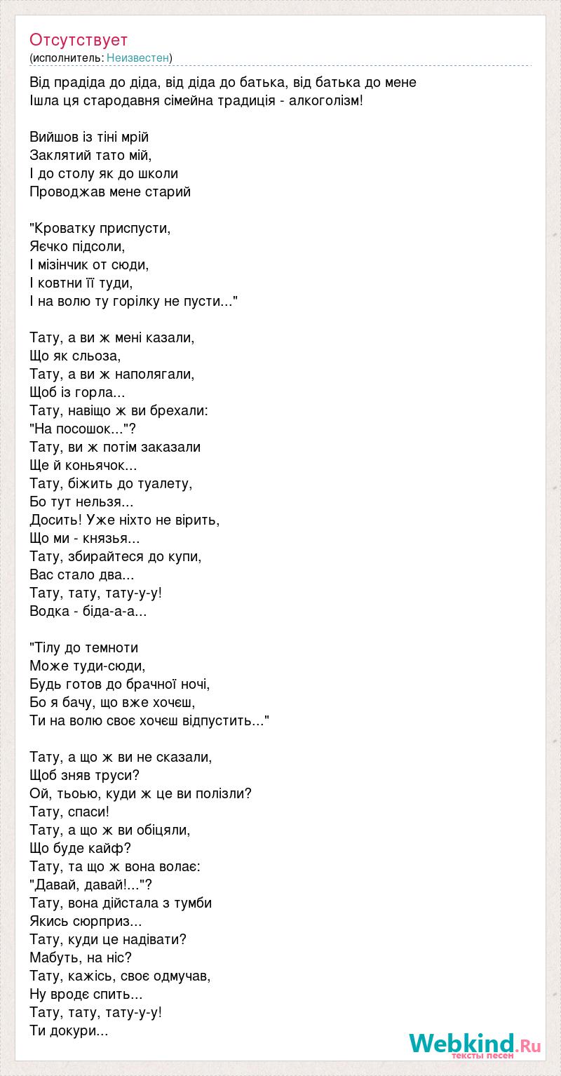 Від прадіда до діда, від діда до батька, від батька до мене Ішла ця стародавня сімейна традиція - алкоголізм! Вийшов із тіні мрій Заклятий тато мій, І до столу як до школи Проводжав мене старий "Кроватку приспусти, Яєчко підсоли, І мізінчик от сюди, І ковтни її туди, І на волю ту горілку не пусти..." Тату, а ви ж мені казали, Що як сльоза, Тату, а ви ж наполягали, Щоб із горла... Тату, навіщо ж ви брехали: "На посошок..."? Тату, ви ж потім заказали Ще й коньячок... Тату, біжить до туалету, Бо тут нельзя... Досить! Уже ніхто не вірить, Що ми - князья... Тату, збирайтеся до купи, Вас стало два... Тату, тату, тату-у-у! Водка - біда-а-а... "Тілу до темноти Може туди-сюди, Будь готов до брачної ночі, Бо я бачу, що вже хочєш, Ти на волю своє хочєш відпустить..." Тату, а що ж ви не сказали, Щоб зняв труси? Ой, тьоью, куди ж це ви полізли? Тату, спаси! Тату, а що ж ви обіцяли, Що буде кайф? Тату, та що ж вона волає: "Давай, давай!..."? Тату, вона дійстала з тумби Якись сюрприз... Тату, куди це надівати? Мабуть, на ніс? Тату, кажісь, своє одмучав, Ну вродє спить... Тату, тату, тату-у-у! Ти докури...