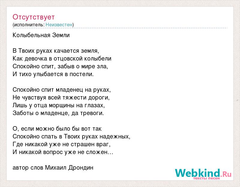 Колыбельная Земли В Твоих руках качается земля, Как девочка в отцовской колыбели Спокойно спит, забыв о мире зла, И тихо улыбается в постели. Спокойно спит младенец на руках, Не чувствуя всей тяжести дороги, Лишь у отца морщины на глазах, Заботы о младенце, да тревоги. О, если можно было бы вот так Спокойно спать в Твоих руках надежных, Где никакой уже не страшен враг, И никакой вопрос уже не сложен… автор слов Михаил Дрондин