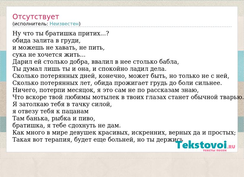 Ну что ты братишка притих...? обида залита в груди, и можешь не хавать, не пить, сука не хочется жить... Дарил ей столько добра, ввалил в нее столько бабла, Ты думал лишь ты и она, и спокойно ладил дела. Сколько потерянных дней, конечно, может быть, но только не с ней, Сколько потерянных лет, обида прожигает грудь до боли сильнее. Ничего, потерпи месяцок, я это сам не по рассказам знаю, Что вскоре твой любимы мотылек в твоих глазах станет обычной тварью. Я затолкаю тебя в тачку силой, я отвезу тебя к пацанам Там банька, рыбка и пиво, братишка, я тебе сдохнуть не дам. Как много в мире девушек красивых, искренних, верных да и простых; Такая вот терапия, будет еще больней, но ты держись