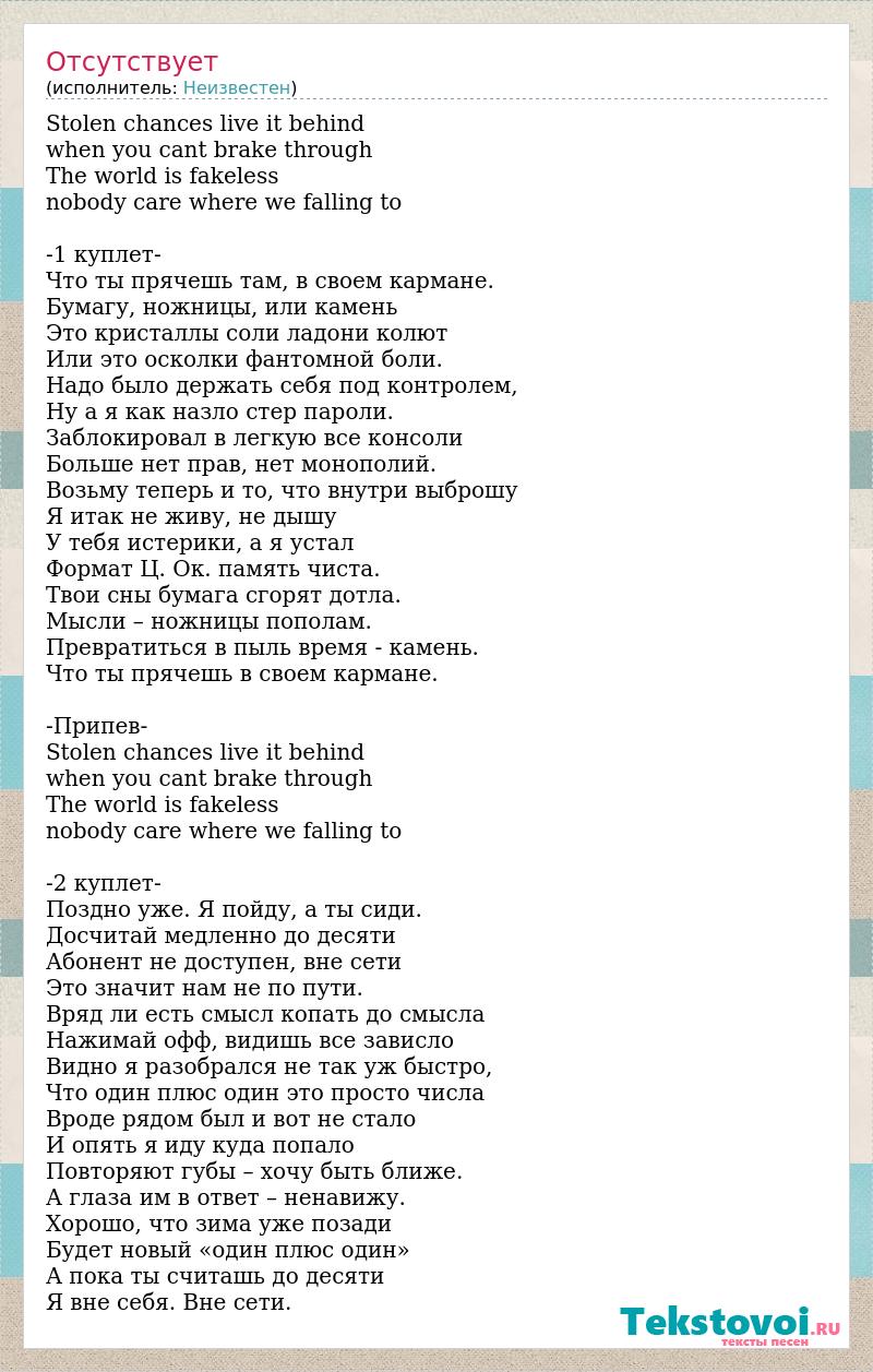 Stolen chances live it behind when you cant brake through The world is fakeless nobody care where we falling to -1 куплет- Что ты прячешь там, в своем кармане. Бумагу, ножницы, или камень Это кристаллы соли ладони колют Или это осколки фантомной боли. Надо было держать себя под контролем, Ну а я как назло стер пароли. Заблокировал в легкую все консоли Больше нет прав, нет монополий. Возьму теперь и то, что внутри выброшу Я итак не живу, не дышу У тебя истерики, а я устал Формат Ц. Ок. память чиста. Твои сны бумага сгорят дотла. Мысли – ножницы пополам. Превратиться в пыль время - камень. Что ты прячешь в своем кармане. -Припев- Stolen chances live it behind when you cant brake through The world is fakeless nobody care where we falling to -2 куплет- Поздно уже. Я пойду, а ты сиди. Досчитай медленно до десяти Абонент не доступен, вне сети Это значит нам не по пути. Вряд ли есть смысл копать до смысла Нажимай офф, видишь все зависло Видно я разобрался не так уж быстро, Что один плюс один это просто числа Вроде рядом был и вот не стало И опять я иду куда попало Повторяют губы – хочу быть ближе. А глаза им в ответ – ненавижу. Хорошо, что зима уже позади Будет новый «один плюс один» А пока ты считашь до десяти Я вне себя. Вне сети.