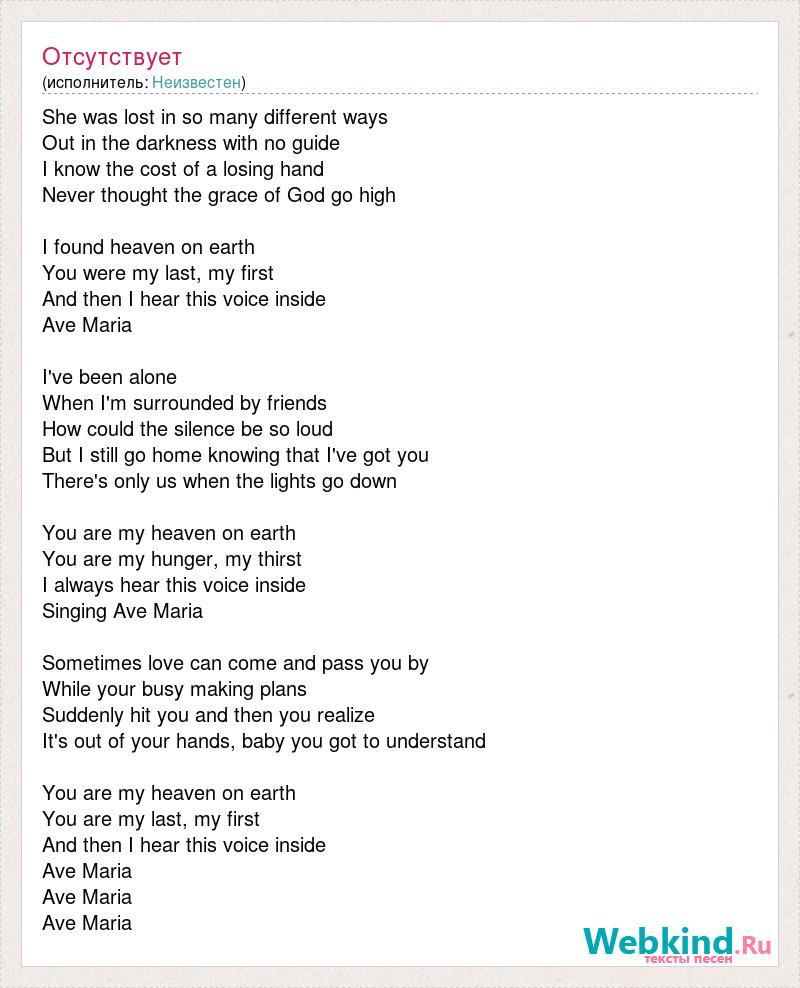 She was lost in so many different ways Out in the darkness with no guide I know the cost of a losing hand Never thought the grace of God go high I found heaven on earth You were my last, my first And then I hear this voice inside Ave Maria I've been alone When I'm surrounded by friends How could the silence be so loud But I still go home knowing that I've got you There's only us when the lights go down You are my heaven on earth You are my hunger, my thirst I always hear this voice inside Singing Ave Maria Sometimes love [bad word] and pass you by While your busy making plans Suddenly hit you and then you realize It's out of your hands, baby you got to understand You are my heaven on earth You are my last, my first And then I hear this voice inside Ave Maria Ave Maria Ave Maria