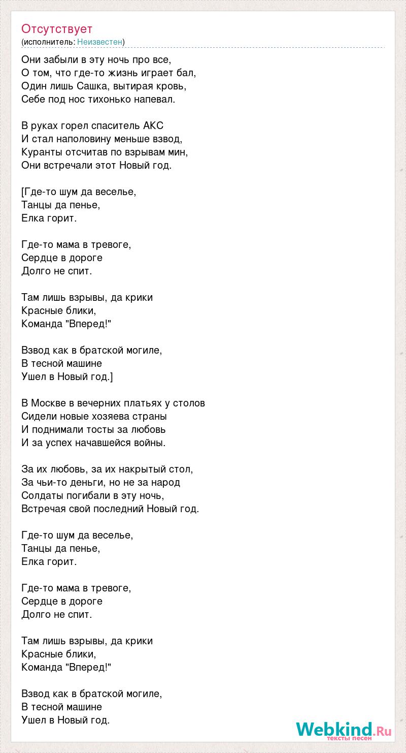 Они забыли в эту ночь про все, О том, что где-то жизнь играет бал, Один лишь Сашка, вытирая кровь, Себе под нос тихонько напевал. В руках горел спаситель АКС И стал наполовину меньше взвод, Куранты отсчитав по взрывам мин, Они встречали этот Новый год. [Где-то шум да веселье, Танцы да пенье, Елка горит. Где-то мама в тревоге, Сердце в дороге Долго не спит. Там лишь взрывы, да крики Красные блики, Команда "Вперед!" Взвод как в братской могиле, В тесной машине Ушел в Новый год.] В Москве в вечерних платьях у столов Сидели новые хозяева страны И поднимали тосты за любовь И за успех начавшейся войны. За их любовь, за их накрытый стол, За чьи-то деньги, но не за народ Солдаты погибали в эту ночь, Встречая свой последний Новый год. Где-то шум да веселье, Танцы да пенье, Елка горит. Где-то мама в тревоге, Сердце в дороге Долго не спит. Там лишь взрывы, да крики Красные блики, Команда "Вперед!" Взвод как в братской могиле, В тесной машине Ушел в Новый год.