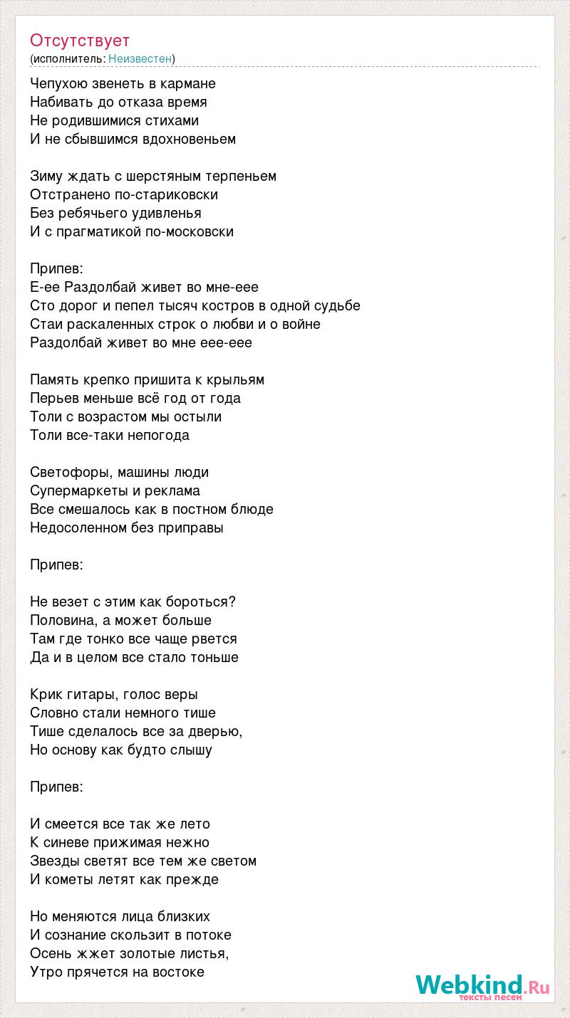 Чепухою звенеть в кармане Набивать до отказа время Не родившимися стихами И не сбывшимся вдохновеньем Зиму ждать с шерстяным терпеньем Отстранено по-стариковски Без ребячьего удивленья И с прагматикой по-московски Припев: Е-ее Раздолбай живет во мне-еее Сто дорог и пепел тысяч костров в одной судьбе Стаи раскаленных строк о любви и о войне Раздолбай живет во мне еее-еее Память крепко пришита к крыльям Перьев меньше всё год от года Толи с возрастом мы остыли Толи все-таки непогода Светофоры, машины люди Супермаркеты и реклама Все смешалось как в постном блюде Недосоленном без приправы Припев: Не везет с этим как бороться? Половина, а может больше Там где тонко все чаще рвется Да и в целом все стало тоньше Крик гитары, голос веры Словно стали немного тише Тише сделалось все за дверью, Но основу как будто слышу Припев: И смеется все так же лето К синеве прижимая нежно Звезды светят все тем же светом И кометы летят как прежде Но меняются лица близких И сознание скользит в потоке Осень жжет золотые листья, Утро прячется на востоке