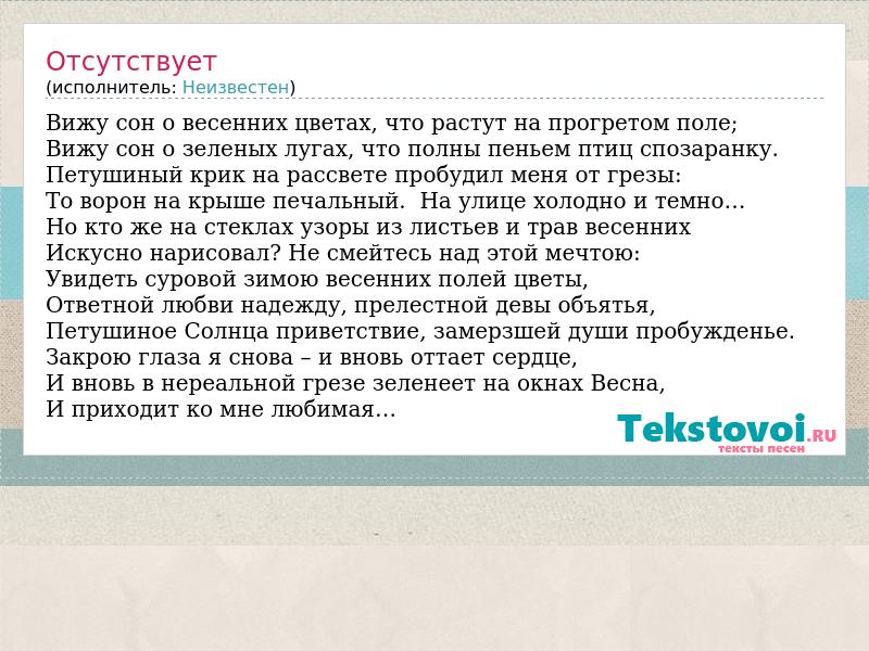Вижу сон о весенних цветах, что растут на прогретом поле; Вижу сон о зеленых лугах, что полны пеньем птиц спозаранку. Петушиный крик на рассвете пробудил меня от грезы: То ворон на крыше печальный. На улице холодно и темно… Но кто же на стеклах узоры из листьев и трав весенних Искусно нарисовал? Не смейтесь над этой мечтою: Увидеть суровой зимою весенних полей цветы, Ответной любви надежду, прелестной девы объятья, Петушиное Солнца приветствие, замерзшей души пробужденье. Закрою глаза я снова – и вновь оттает сердце, И вновь в нереальной грезе зеленеет на окнах Весна, И приходит ко мне любимая…