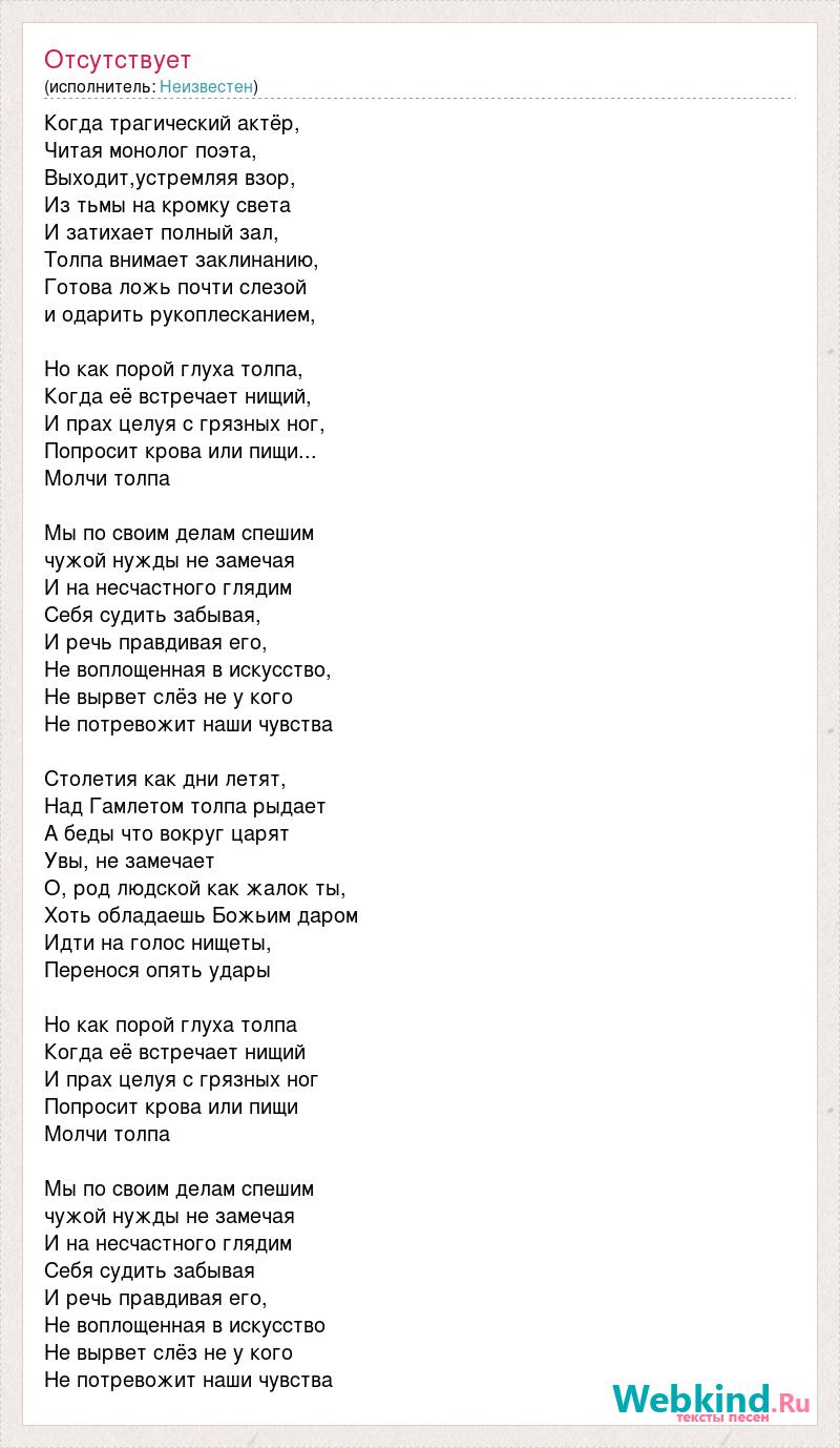 Когда трагический актёр, Читая монолог поэта, Выходит,устремляя взор, Из тьмы на кромку света И затихает полный зал, Толпа внимает заклинанию, Готова ложь почти слезой и одарить рукоплесканием, Но как порой глуха толпа, Когда её встречает нищий, И прах целуя с грязных ног, Попросит крова или пищи... Молчи толпа Мы по своим делам спешим чужой нужды не замечая И на несчастного глядим Себя судить забывая, И речь правдивая его, Не воплощенная в искусство, Не вырвет слёз не у кого Не потревожит наши чувства Столетия как дни летят, Над Гамлетом толпа рыдает А беды что вокруг царят Увы, не замечает О, род людской как жалок ты, Хоть обладаешь Божьим даром Идти на голос нищеты, Перенося опять удары Но как порой глуха толпа Когда её встречает нищий И прах целуя с грязных ног Попросит крова или пищи Молчи толпа Мы по своим делам спешим чужой нужды не замечая И на несчастного глядим Себя судить забывая И речь правдивая его, Не воплощенная в искусство Не вырвет слёз не у кого Не потревожит наши чувства