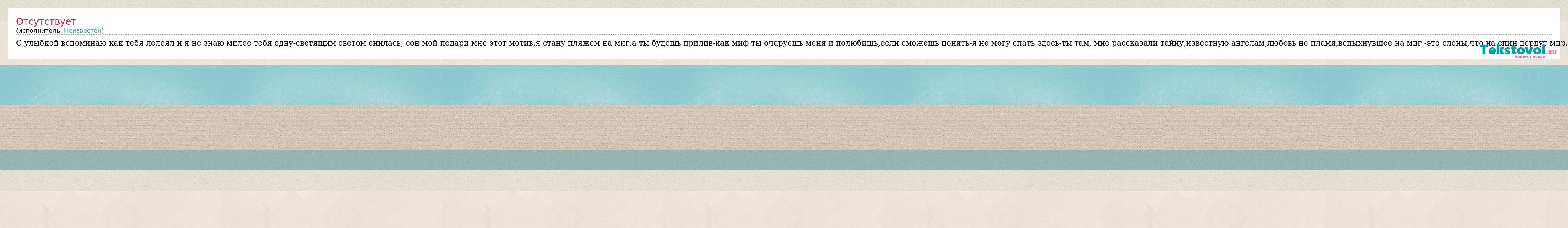 С улыбкой вспоминаю как тебя лелеял и я не знаю милее тебя одну-светящим светом снилась, сон мой подари мне этот мотив,я стану пляжем на миг,а ты будешь прилив-как миф ты очаруешь меня и полюбишь,если сможешь понять-я не могу спать здесь-ты там, мне рассказали тайну,известную ангелам,любовь не пламя,вспыхнувшее на миг -это слоны,что на спин дердут мир.