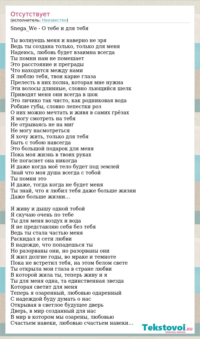 Snega_We - О тебе и для тебя Ты волнуешь меня и наверно не зря Ведь ты создана только, только для меня Надеюсь, любовь будет взаимна всегда Ты помни нам не помешает Это расстояние и преграды Что находятся между нами Я люблю тебя, твои карие глаза Прелесть в них полна, которая мне нужна Эти волосы длинные, словно льющийся шелк Приводят меня они всегда в шок Это личико так чисто, как родниковая вода Робкие губы, словно лепестки роз О них можно мечтать и живя в самих грёзах Я могу смотреть на тебя Не отрываясь не на миг Не могу насмотреться Я хочу жить, только для тебя Быть с тобою навсегда Это большой подарок для меня Пока моя жизнь в твоих руках Не погаснет она никогда И даже когда моё тело будет под землей Знай что моя душа всегда с тобой Ты помни это И даже, тогда когда не будет меня Ты знай, что я любил тебя даже больше жизни Даже больше жизни… Я живу и дышу одной тобой Я скучаю очень по тебе Ты для меня воздух и вода Я не представляю себя без тебя Ведь ты стала частью меня Раскидал я сети любви В надежде, что попадешься ты Но разорваны они, но разорваны они Я жил долгие годы, во мраке и темноте Пока не встретил тебя, на этом белом свете Ты открыла мои глаза в стране любви В которой жила ты, теперь живу и я Ты для меня одна, та единственная звезда Которая светит для меня Теперь я озаренный, любовью одаренный С надеждой буду думать о нас Открывая в светлое будущее дверь Дверь, в мир созданный для нас В мир в котором мы озарены, любовью Счастьем навеки, любовью счастьем навеки…