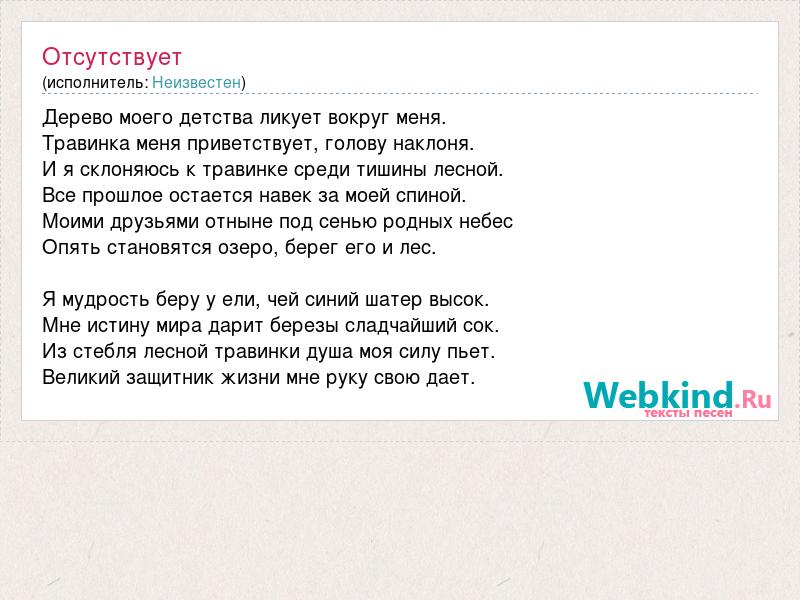 Дерево моего детства ликует вокруг меня. Травинка меня приветствует, голову наклоня. И я склоняюсь к травинке среди тишины лесной. Все прошлое остается навек за моей спиной. Моими друзьями отныне под сенью родных небес Опять становятся озеро, берег его и лес. Я мудрость беру у ели, чей синий шатер высок. Мне истину мира дарит березы сладчайший сок. Из стебля лесной травинки душа моя силу пьет. Великий защитник жизни мне руку свою дает.