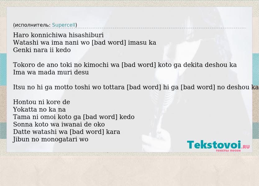 Haro konnichiwa hisashiburi Watashi wa ima nani wo [bad word] imasu ka Genki nara ii kedo Tokoro de ano toki no kimochi wa [bad word] koto ga dekita deshou ka Ima wa mada muri desu Itsu no hi ga motto toshi wo tottara [bad word] hi ga [bad word] no deshou ka Hontou ni kore de Yokatta no ka na Tama ni omoi koto ga [bad word] kedo Sonna koto wa iwanai de oko Datte watashi wa [bad word] kara Jibun no monogatari wo