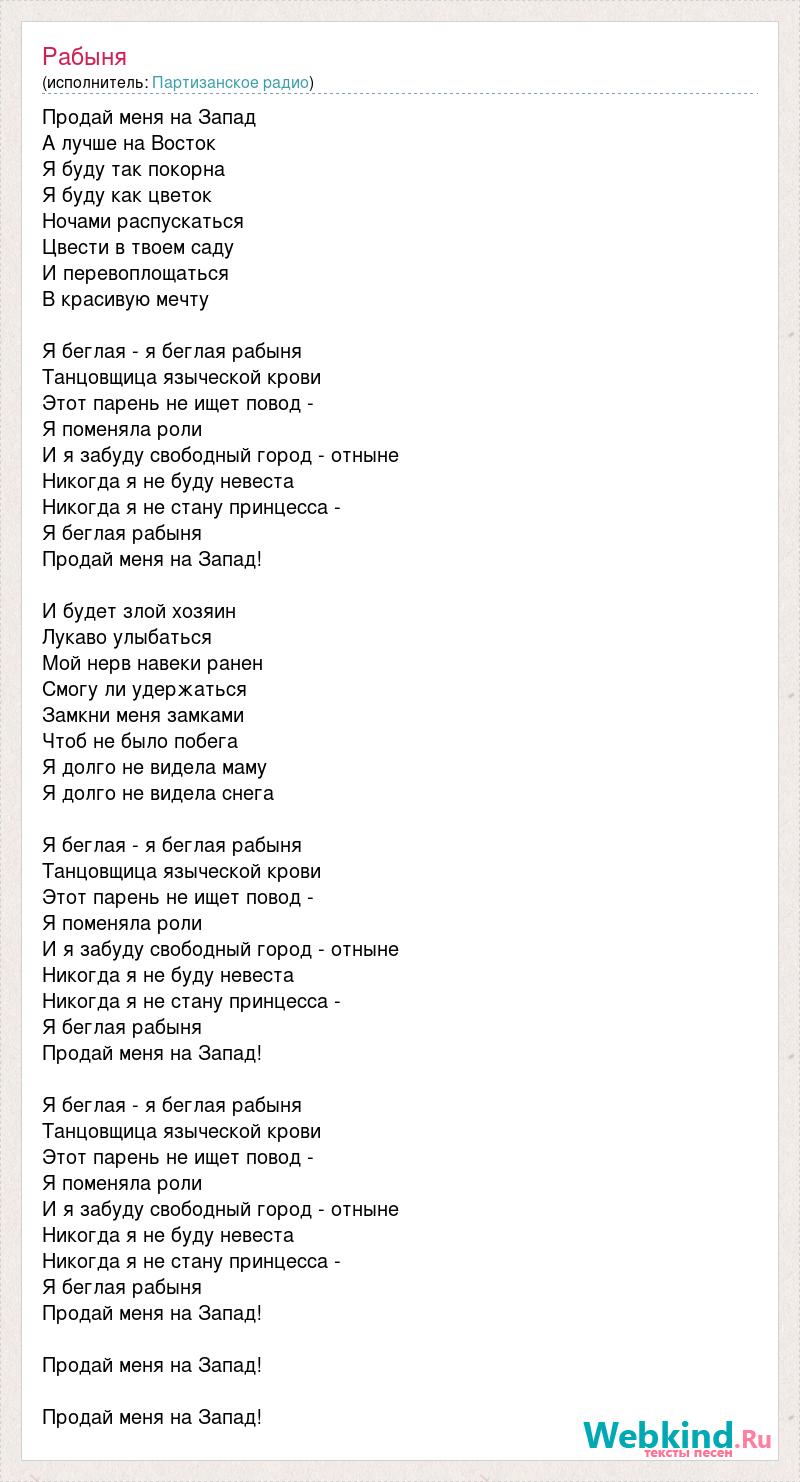 Продай меня на Запад А лучше на Восток Я буду так покорна Я буду как цветок Ночами распускаться Цвести в твоем саду И перевоплощаться В красивую мечту Я беглая - я беглая рабыня Танцовщица языческой крови Этот парень не ищет повод - Я поменяла роли И я забуду свободный город - отныне Никогда я не буду невеста Никогда я не стану принцесса - Я беглая рабыня Продай меня на Запад! И будет злой хозяин Лукаво улыбаться Мой нерв навеки ранен Смогу ли удержаться Замкни меня замками Чтоб не было побега Я долго не видела маму Я долго не видела снега Я беглая - я беглая рабыня Танцовщица языческой крови Этот парень не ищет повод - Я поменяла роли И я забуду свободный город - отныне Никогда я не буду невеста Никогда я не стану принцесса - Я беглая рабыня Продай меня на Запад! Я беглая - я беглая рабыня Танцовщица языческой крови Этот парень не ищет повод - Я поменяла роли И я забуду свободный город - отныне Никогда я не буду невеста Никогда я не стану принцесса - Я беглая рабыня Продай меня на Запад! Продай меня на Запад! Продай меня на Запад!