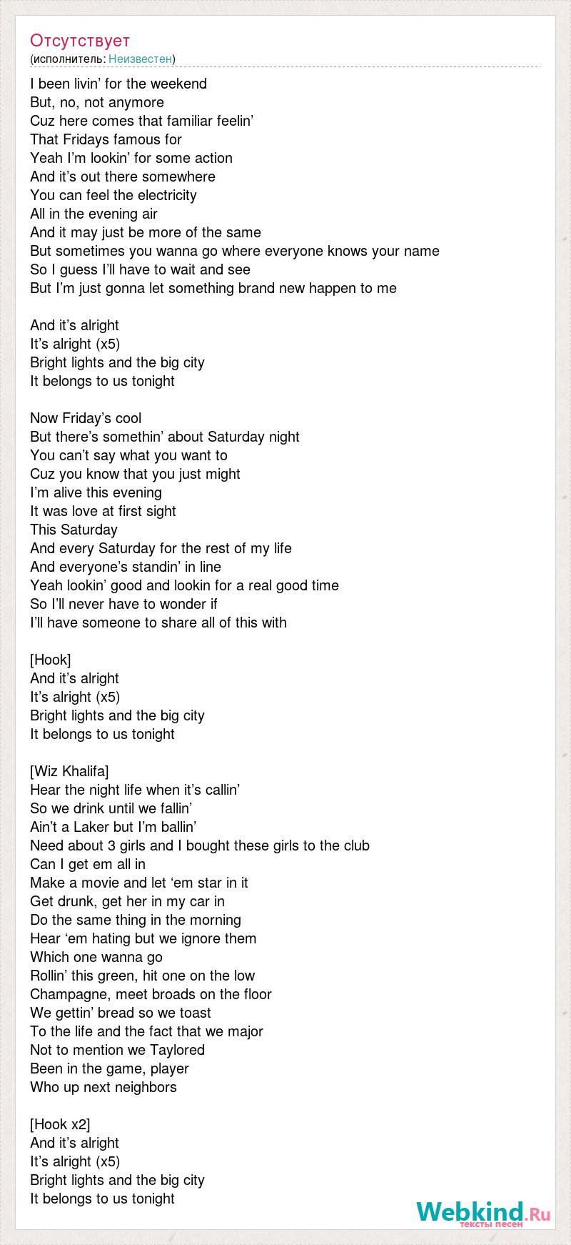 I been livin’ for the weekend But, no, not anymore Cuz [bad word] that familiar feelin’ That Fridays famous for Yeah I’m lookin’ for some action And it’s out there somewhere You can feel the electricity All in the evening air And it may just be more of the same But sometimes you wanna go where everyone knows your name So I guess I’ll have to wait and see But I’m just gonna let something brand new happen to me And it’s alright It’s alright (x5) Bright lights and the big city It belongs to us tonight Now Friday’s cool But there’s somethin’ about Saturday night You can’t say what you want to Cuz you know that you just might I’m alive this evening It was love at first sight This Saturday And every Saturday for the rest of my life And everyone’s standin’ in line Yeah lookin’ good and lookin for a real good time So I’ll never have to wonder if I’ll have someone to share all of this with [Hook] And it’s alright It’s alright (x5) Bright lights and the big city It belongs to us tonight [Wiz Khalifa] Hear the night life when it’s callin’ So we drink until we fallin’ Ain’t a Laker but I’m ballin’ Need about 3 girls and I bought these girls to the club Can I get em all in Make a movie and let ‘em star in it Get [bad word] get her in my car in Do the same thing in the morning Hear ‘em hating but we ignore them Which one wanna go Rollin’ this green, hit one on the low Champagne, meet broads on the floor We gettin’ bread so we toast To the life and the fact that we major Not to mention we Taylored Been in the game, player Who up next neighbors [Hook x2] And it’s alright It’s alright (x5) Bright lights and the big city It belongs to us tonight