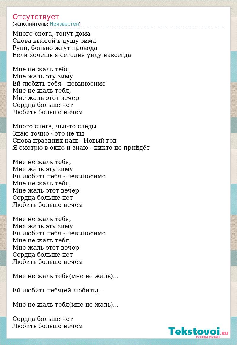 Много снега, тонут дома Снова вьюгой в душу зима Руки, больно жгут провода Если хочешь я сегодня уйду навсегда Мне не жаль тебя, Мне жаль эту зиму Ей любить тебя - невыносимо Мне не жаль тебя, Мне жаль этот вечер Сердца больше нет Любить больше нечем Много снега, чьи-то следы Знаю точно - это не ты Снова праздник наш - Новый год Я смотрю в окно и знаю - никто не прийдёт Мне не жаль тебя, Мне жаль эту зиму Ей любить тебя - невыносимо Мне не жаль тебя, Мне жаль этот вечер Сердца больше нет Любить больше нечем Мне не жаль тебя, Мне жаль эту зиму Ей любить тебя - невыносимо Мне не жаль тебя, Мне жаль этот вечер Сердца больше нет Любить больше нечем Мне не жаль тебя(мне не жаль)... Ей любить тебя(ей любить)... Мне не жаль тебя(мне не жаль)... Сердца больше нет Любить больше нечем