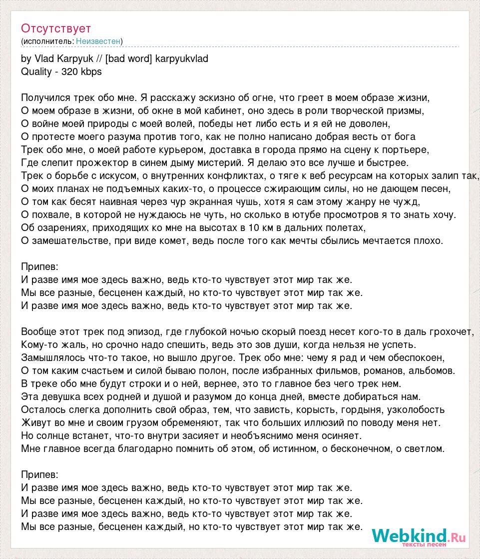 by Vlad Karpyuk // [bad word] karpyukvlad Quality - 320 kbps Получился трек обо мне. Я расскажу эскизно об огне, что греет в моем образе жизни, О моем образе в жизни, об окне в мой кабинет, оно здесь в роли творческой призмы, О войне моей природы с моей волей, победы нет либо есть и я ей не доволен, О протесте моего разума против того, как не полно написано добрая весть от бога Трек обо мне, о моей работе курьером, доставка в города прямо на сцену к портьере, Где слепит прожектор в синем дыму мистерий. Я делаю это все лучше и быстрее. Трек о борьбе с искусом, о внутренних конфликтах, о тяге к веб ресурсам на которых залип так, О моих планах не подъемных каких-то, о процессе сжирающим силы, но не дающем песен, О том как бесят наивная через чур экранная чушь, хотя я сам этому жанру не чужд, О похвале, в которой не нуждаюсь не чуть, но сколько в ютубе просмотров я то знать хочу. Об озарениях, приходящих ко мне на высотах в 10 км в дальних полетах, О замешательстве, при виде комет, ведь после того как мечты сбылись мечтается плохо. Припев: И разве имя мое здесь важно, ведь кто-то чувствует этот мир так же. Мы все разные, бесценен каждый, но кто-то чувствует этот мир так же. И разве имя мое здесь важно, ведь кто-то чувствует этот мир так же. Вообще этот трек под эпизод, где глубокой ночью скорый поезд несет кого-то в даль грохочет, Кому-то жаль, но срочно надо спешить, ведь это зов души, когда нельзя не успеть. Замышлялось что-то такое, но вышло другое. Трек обо мне: чему я рад и чем обеспокоен, О том каким счастьем и силой бываю полон, после избранных фильмов, романов, альбомов. В треке обо мне будут строки и о ней, вернее, это то главное без чего трек нем. Эта девушка всех родней и душой и разумом до конца дней, вместе добираться нам. Осталось слегка дополнить свой образ, тем, что зависть, корысть, гордыня, узколобость Живут во мне и своим грузом обременяют, так что больших иллюзий по поводу меня нет. Но солнце встанет, что-то внутри засияет и необъяснимо меня осиняет. Мне главное всегда благодарно помнить об этом, об истинном, о бесконечном, о светлом. Припев: И разве имя мое здесь важно, ведь кто-то чувствует этот мир так же. Мы все разные, бесценен каждый, но кто-то чувствует этот мир так же. И разве имя мое здесь важно, ведь кто-то чувствует этот мир так же. Мы все разные, бесценен каждый, но кто-то чувствует этот мир так же.