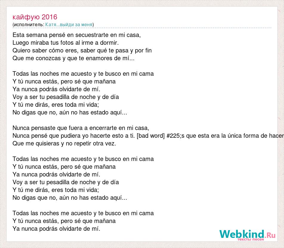 Esta semana pensé en secuestrarte en mi casa, Luego miraba tus fotos al irme a dormir. Quiero saber cómo eres, saber qué te pasa y por fin Que me conozcas y que te enamores de mí... Todas las noches me acuesto y te busco en mi cama Y tú nunca estás, pero sé que mañana Ya nunca podrás olvidarte de mí. Voy a ser tu pesadilla de noche y de día Y tú me dirás, eres toda mi vida; No digas que no, aún no has estado aquí... Nunca pensaste que fuera a encerrarte en mi casa, Nunca pensé que pudiera yo hacerte esto a ti. [bad word] #225;s que esta era la única forma de hacer Que me quisieras y no repetir otra vez. Todas las noches me acuesto y te busco en mi cama Y tú nunca estás, pero sé que mañana Ya nunca podrás olvidarte de mí. Voy a ser tu pesadilla de noche y de día Y tú me dirás, eres toda mi vida; No digas que no, aún no has estado aquí... Todas las noches me acuesto y te busco en mi cama Y tú nunca estás, pero sé que mañana Ya nunca podrás olvidarte de mí.