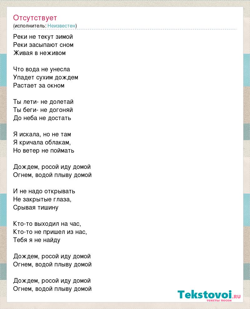 Реки не текут зимой Реки засыпают сном Живая в неживом Что вода не унесла Упадет сухим дождем Растает за окном Ты лети- не долетай Ты беги- не догоняй До неба не достать Я искала, но не там Я кричала облакам, Но ветер не поймать Дождем, росой иду домой Огнем, водой плыву домой И не надо открывать Не закрытые глаза, Срывая тишину Кто-то выходил на час, Кто-то не пришел из нас, Тебя я не найду Дождем, росой иду домой Огнем, водой плыву домой Дождем, росой иду домой Огнем, водой плыву домой