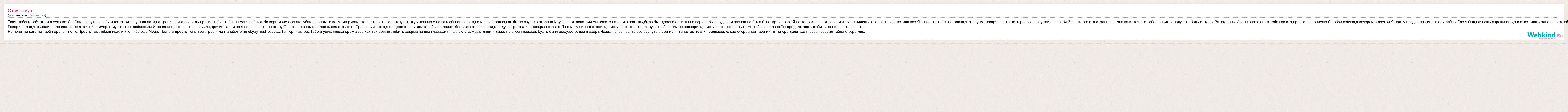 Твоя любовь тебя же и с ума сведёт. Сама запутала себя и вот:стоишь у пропасти,на грани срыва,а я ведь просил тебя,чтобы ты меня забыла.Не верь моим словам,губам не верь тоже.Моим рукам,что ласкали твою нежную кожу,я ложью уже захлебываюсь сам,но мне всё равно,как бы не звучало странно.Круговорот действий мы вместе падаем в постель,было бы здорово,если ты не верила бы в чудеса и слепой не была бы-открой глаза!Я не тот,уже не тот совсем и ты не видишь этого,хоть и заметили все.Я знаю,что тебе все равно,что другие говорят,но ты хоть раз их послушай,а не себя.Знаешь,все это странно,но мне кажется,что тебе нравится получать боль от меня.Затем раны.И я не знаю зачем тебе все это,просто не понимаю.С тобой сейчас,а вечером с другой.Я приду поздно,на лице твоем слёзы.Где я был,начнешь спрашивать,а в ответ лишь одно:не важно! Говорила мне,что люди не меняются,но я живой пример тому,что ты ошибаешься.И не важно,что на это повлияло,причин валом,но я перечислять не стану!Просто не верь мне,мои слова это ложь.Признания тоже,я не дороже чем должен был и может быть все сказано зря,моя душа грешна и я прекрасно знаю.Я не могу ничего строить,я могу лишь только разрушать.И с этим не поспорить,я могу лишь все портить.Но тебе все равно.Ты продолжаешь любить,но не понятно за что. Не понятно кого,не твой парень - не то.Просто так любовник,или кто либо еще.Может быть я просто тень твоя,грез и мечтаний,что не сбудутся.Поверь...Ты терпишь все.Тебе я удивляюсь,поражаюсь как так можно любить закрыв на все глаза...и я наглею с каждым днем и даже не стесняюсь,как будто бы игрок,уже вошел в азарт.Назад нельзя,взять все вернуть и зря меня ты встретила и пролилась слеза очередная твоя и что теперь делать,а я ведь говорил тебе:не верь мне.