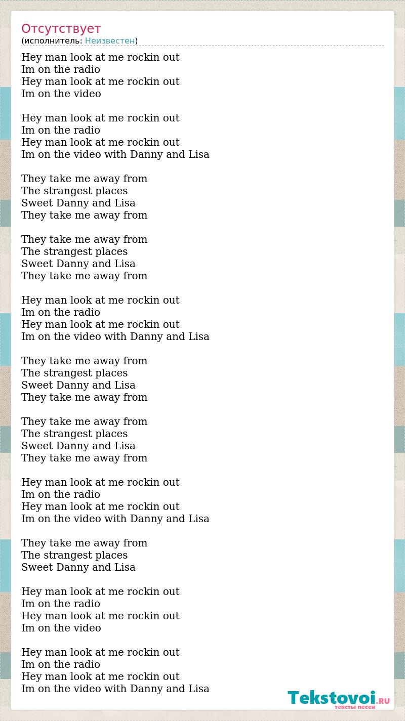 Hey man look at me rockin out Im on the radio Hey man look at me rockin out Im on the video Hey man look at me rockin out Im on the radio Hey man look at me rockin out Im on the video with Danny and Lisa They take me away from The strangest places Sweet Danny and Lisa They take me away from They take me away from The strangest places Sweet Danny and Lisa They take me away from Hey man look at me rockin out Im on the radio Hey man look at me rockin out Im on the video with Danny and Lisa They take me away from The strangest places Sweet Danny and Lisa They take me away from They take me away from The strangest places Sweet Danny and Lisa They take me away from Hey man look at me rockin out Im on the radio Hey man look at me rockin out Im on the video with Danny and Lisa They take me away from The strangest places Sweet Danny and Lisa Hey man look at me rockin out Im on the radio Hey man look at me rockin out Im on the video Hey man look at me rockin out Im on the radio Hey man look at me rockin out Im on the video with Danny and Lisa