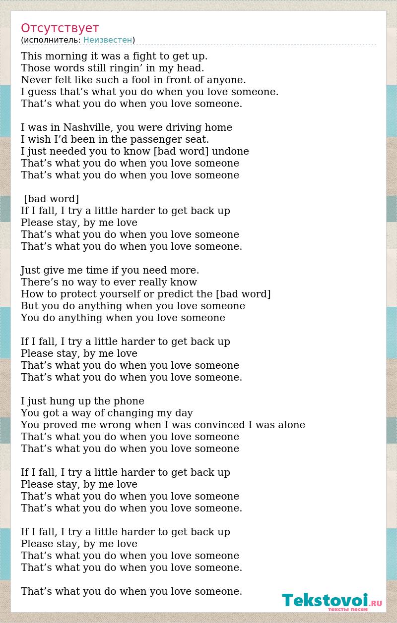 This morning it was a fight to get up. Those words still ringin’ in my head. Never felt like such a fool in front of anyone. I guess that’s what you do when you love someone. That’s what you do when you love someone. I was in Nashville, you were driving home I wish I’d been in the passenger seat. I just needed you to know [bad word] undone That’s what you do when you love someone That’s what you do when you love someone [bad word] If I fall, I try a little harder to get back up Please stay, by me love That’s what you do when you love someone That’s what you do when you love someone. Just give me time if you need more. There’s no way to ever really know How to protect yourself or predict the [bad word] But you do anything when you love someone You do anything when you love someone If I fall, I try a little harder to get back up Please stay, by me love That’s what you do when you love someone That’s what you do when you love someone. I just hung up the phone You got a way of changing my day You proved me wrong when I was convinced I was alone That’s what you do when you love someone That’s what you do when you love someone If I fall, I try a little harder to get back up Please stay, by me love That’s what you do when you love someone That’s what you do when you love someone. If I fall, I try a little harder to get back up Please stay, by me love That’s what you do when you love someone That’s what you do when you love someone. That’s what you do when you love someone.