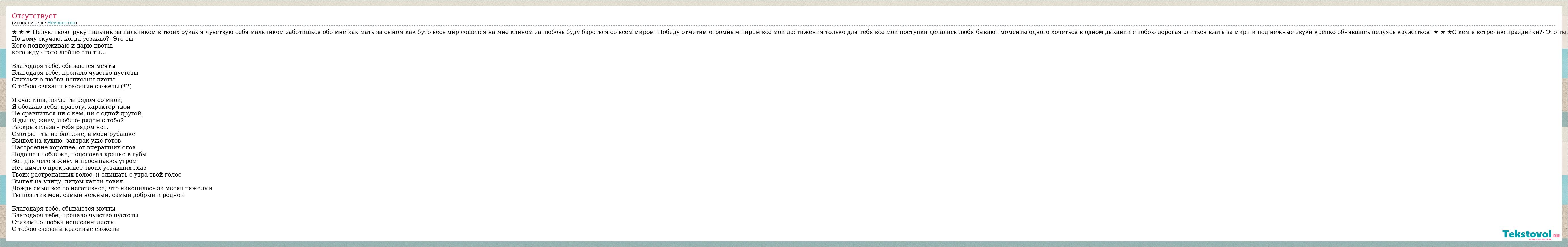 ★ ★ ★ Целую твою руку пальчик за пальчиком в твоих руках я чувствую себя мальчиком заботишься обо мне как мать за сыном как буто весь мир сошелся на мне клином за любовь буду бароться со всем миром. Победу отметим огромным пиром все мои достижения только для тебя все мои поступки делались любя бывают моменты одного хочеться в одном дыхании с тобою дорогая слиться взать за мири и под нежные звуки крепко обнявшись целуясь кружиться ★ ★ ★С кем я встречаю праздники?- Это ты, По кому скучаю, когда уезжаю?- Это ты. Кого поддерживаю и дарю цветы, кого жду - того люблю это ты... Благодаря тебе, сбываются мечты Благодаря тебе, пропало чувство пустоты Стихами о любви исписаны листы С тобою связаны красивые сюжеты (*2) Я счастлив, когда ты рядом со мной, Я обожаю тебя, красоту, характер твой Не сравниться ни с кем, ни с одной другой, Я дышу, живу, люблю- рядом с тобой. Раскрыв глаза - тебя рядом нет. Смотрю - ты на балконе, в моей рубашке Вышел на кухню- завтрак уже готов Настроение хорошее, от вчерашних слов Подошел поближе, поцеловал крепко в губы Вот для чего я живу и просыпаюсь утром Нет ничего прекраснее твоих уставших глаз Твоих растрепанных волос, и слышать с утра твой голос Вышел на улицу, лицом капли ловил Дождь смыл все то негативное, что накопилось за месяц тяжелый Ты позитив мой, самый нежный, самый добрый и родной. Благодаря тебе, сбываются мечты Благодаря тебе, пропало чувство пустоты Стихами о любви исписаны листы С тобою связаны красивые сюжеты
