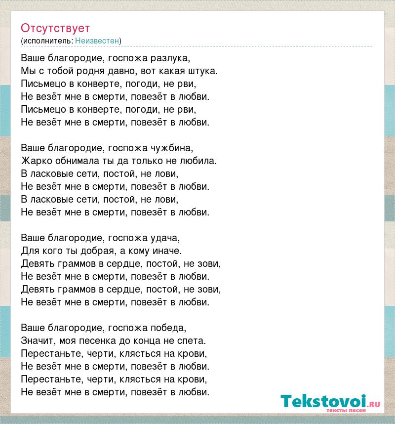Ваше благородие, госпожа разлука, Мы с тобой родня давно, вот какая штука. Письмецо в конверте, погоди, не рви, Не везёт мне в смерти, повезёт в любви. Письмецо в конверте, погоди, не рви, Не везёт мне в смерти, повезёт в любви. Ваше благородие, госпожа чужбина, Жарко обнимала ты да только не любила. В ласковые сети, постой, не лови, Не везёт мне в смерти, повезёт в любви. В ласковые сети, постой, не лови, Не везёт мне в смерти, повезёт в любви. Ваше благородие, госпожа удача, Для кого ты добрая, а кому иначе. Девять граммов в сердце, постой, не зови, Не везёт мне в смерти, повезёт в любви. Девять граммов в сердце, постой, не зови, Не везёт мне в смерти, повезёт в любви. Ваше благородие, госпожа победа, Значит, моя песенка до конца не спета. Перестаньте, черти, клясться на крови, Не везёт мне в смерти, повезёт в любви. Перестаньте, черти, клясться на крови, Не везёт мне в смерти, повезёт в любви.
