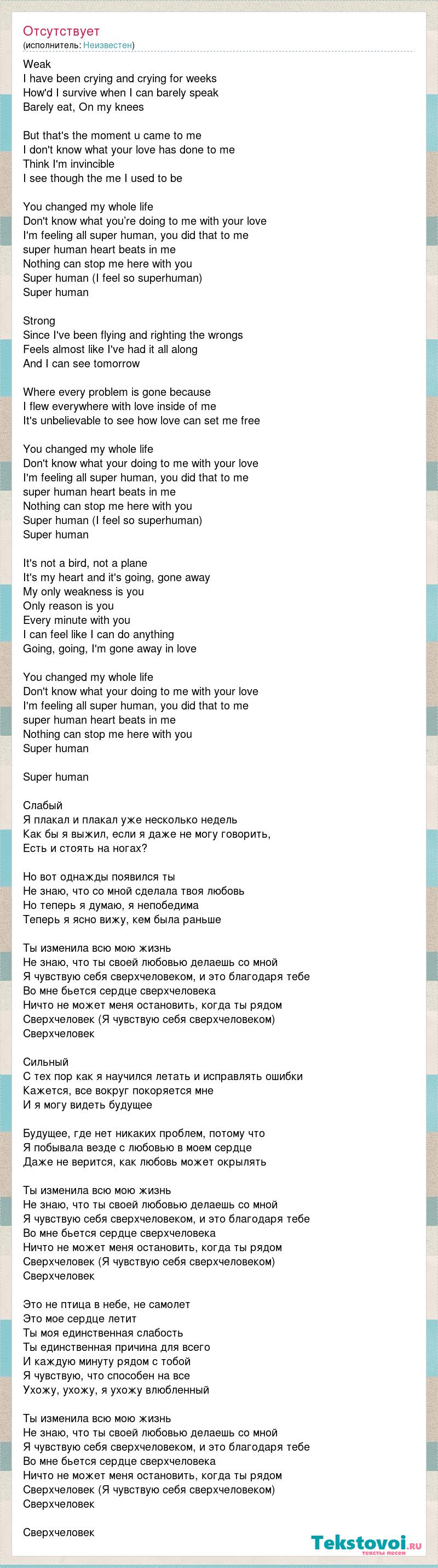 Weak I have been crying and crying for weeks How'd I survive when I can barely speak Barely eat, On my knees But that's the moment u came to me I don't know what your love has done to me Think I'm invincible I see though the me I used to be You changed my whole life Don't know what you’re doing to me with your love I'm feeling all super human, you did that to me super human heart beats in me Nothing can stop me here with you Super human (I feel so superhuman) Super human Strong Since I've been flying and righting the wrongs Feels almost like I've had it all along And I can see tomorrow Where every problem is gone because I flew everywhere with love inside of me It's unbelievable to see how love can set me free You changed my whole life Don't know what your doing to me with your love I'm feeling all super human, you did that to me super human heart beats in me Nothing can stop me here with you Super human (I feel so superhuman) Super human It's not a bird, not a plane It's my heart and it's going, gone away My only weakness is you Only reason is you Every minute with you I can feel like I can do anything Going, going, I'm gone away in love You changed my whole life Don't know what your doing to me with your love I'm feeling all super human, you did that to me super human heart beats in me Nothing can stop me here with you Super human Super human Слабый Я плакал и плакал уже несколько недель Как бы я выжил, если я даже не могу говорить, Есть и стоять на ногах? Но вот однажды появился ты Не знаю, что со мной сделала твоя любовь Но теперь я думаю, я непобедима Теперь я ясно вижу, кем была раньше Ты изменила всю мою жизнь Не знаю, что ты своей любовью делаешь со мной Я чувствую себя сверхчеловеком, и это благодаря тебе Во мне бьется сердце сверхчеловека Ничто не может меня остановить, когда ты рядом Сверхчеловек (Я чувствую себя сверхчеловеком) Сверхчеловек Сильный С тех пор как я научился летать и исправлять ошибки Кажется, все вокруг покоряется мне И я могу видеть будущее Будущее, где нет никаких проблем, потому что Я побывала везде с любовью в моем сердце Даже не верится, как любовь может окрылять Ты изменила всю мою жизнь Не знаю, что ты своей любовью делаешь со мной Я чувствую себя сверхчеловеком, и это благодаря тебе Во мне бьется сердце сверхчеловека Ничто не может меня остановить, когда ты рядом Сверхчеловек (Я чувствую себя сверхчеловеком) Сверхчеловек Это не птица в небе, не самолет Это мое сердце летит Ты моя единственная слабость Ты единственная причина для всего И каждую минуту рядом с тобой Я чувствую, что способен на все Ухожу, ухожу, я ухожу влюбленный Ты изменила всю мою жизнь Не знаю, что ты своей любовью делаешь со мной Я чувствую себя сверхчеловеком, и это благодаря тебе Во мне бьется сердце сверхчеловека Ничто не может меня остановить, когда ты рядом Сверхчеловек (Я чувствую себя сверхчеловеком) Сверхчеловек Сверхчеловек