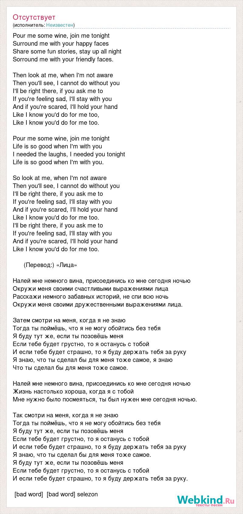 Pour me some wine, join me tonight Surround me with your happy faces Share some fun stories, stay up all night Sorround me with your friendly faces. Then look at me, when I'm not aware Then you'll see, I cannot do without you I'll be right there, if you ask me to If you're feeling sad, I'll stay with you And if you're scared, I'll hold your hand Like I know you'd do for me too, Like I know you'd do for me too. Pour me some wine, join me tonight Life is so good when I'm with you I needed the laughs, I needed you tonight Life is so good when I'm with you. So look at me, when I'm not aware Then you'll see, I cannot do without you I'll be right there, if you ask me to If you're feeling sad, I'll stay with you And if you're scared, I'll hold your hand Like I know you'd do for me too. I'll be right there, if you ask me to If you're feeling sad, I'll stay with you And if you're scared, I'll hold your hand Like I know you'd do for me too. (Перевод:) «Лица» Налей мне немного вина, присоединись ко мне сегодня ночью Окружи меня своими счастливыми выражениями лица Расскажи немного забавных историй, не спи всю ночь Окружи меня своими дружественными выражениями лица. Затем смотри на меня, когда я не знаю Тогда ты поймёшь, что я не могу обойтись без тебя Я буду тут же, если ты позовёшь меня Если тебе будет грустно, то я останусь с тобой И если тебе будет страшно, то я буду держать тебя за руку Я знаю, что ты сделал бы для меня тоже самое, я знаю Что ты сделал бы для меня тоже самое. Налей мне немного вина, присоединись ко мне сегодня ночью Жизнь настолько хороша, когда я с тобой Мне нужно было посмеяться, ты был нужен мне сегодня ночью. Так смотри на меня, когда я не знаю Тогда ты поймёшь, что я не могу обойтись без тебя Я буду тут же, если ты позовёшь меня Если тебе будет грустно, то я останусь с тобой И если тебе будет страшно, то я буду держать тебя за руку Я знаю, что ты сделал бы для меня тоже самое. Я буду тут же, если ты позовёшь меня Если тебе будет грустно, то я останусь с тобой И если тебе будет страшно, то я буду держать тебя за руку. [bad word] [bad word] selezon