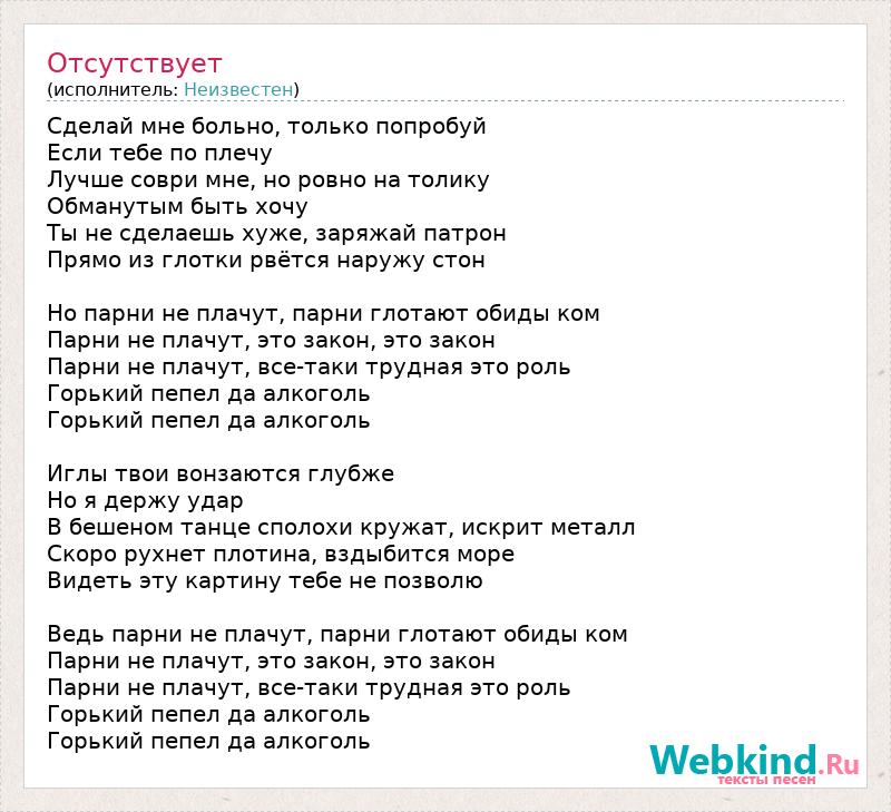 Сделай мне больно, только попробуй Если тебе по плечу Лучше соври мне, но ровно на толику Обманутым быть хочу Ты не сделаешь хуже, заряжай патрон Прямо из глотки рвётся наружу стон Но парни не плачут, парни глотают обиды ком Парни не плачут, это закон, это закон Парни не плачут, все-таки трудная это роль Горький пепел да алкоголь Горький пепел да алкоголь Иглы твои вонзаются глубже Но я держу удар В бешеном танце сполохи кружат, искрит металл Скоро рухнет плотина, вздыбится море Видеть эту картину тебе не позволю Ведь парни не плачут, парни глотают обиды ком Парни не плачут, это закон, это закон Парни не плачут, все-таки трудная это роль Горький пепел да алкоголь Горький пепел да алкоголь