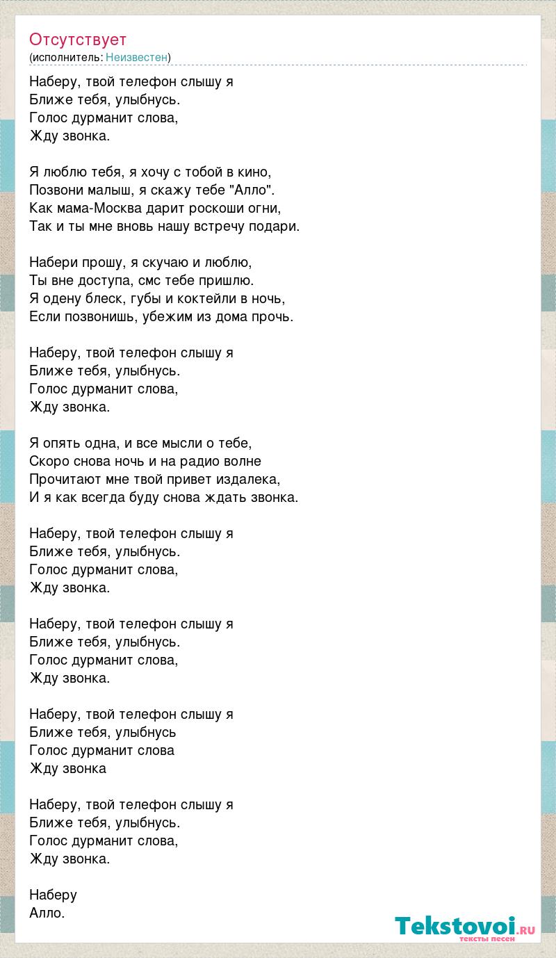 Наберу, твой телефон слышу я Ближе тебя, улыбнусь. Голос дурманит слова, Жду звонка. Я люблю тебя, я хочу с тобой в кино, Позвони малыш, я скажу тебе "Алло". Как мама-Москва дарит роскоши огни, Так и ты мне вновь нашу встречу подари. Набери прошу, я скучаю и люблю, Ты вне доступа, смс тебе пришлю. Я одену блеск, губы и коктейли в ночь, Если позвонишь, убежим из дома прочь. Наберу, твой телефон слышу я Ближе тебя, улыбнусь. Голос дурманит слова, Жду звонка. Я опять одна, и все мысли о тебе, Скоро снова ночь и на радио волне Прочитают мне твой привет издалека, И я как всегда буду снова ждать звонка. Наберу, твой телефон слышу я Ближе тебя, улыбнусь. Голос дурманит слова, Жду звонка. Наберу, твой телефон слышу я Ближе тебя, улыбнусь. Голос дурманит слова, Жду звонка. Наберу, твой телефон слышу я Ближе тебя, улыбнусь Голос дурманит слова Жду звонка Наберу, твой телефон слышу я Ближе тебя, улыбнусь. Голос дурманит слова, Жду звонка. Наберу Алло.