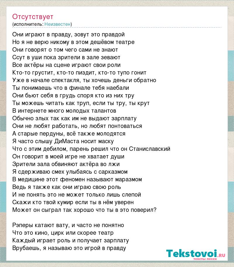 Они играют в правду, зовут это правдой Но я не верю никому в этом дешёвом театре Они говорят о том чего сами не знают Сcут в уши пока зрители в зале зевают Все актёры на сцене играют свои роли Кто-то грустит, кто-то пиздит, кто-то тупо гонит Уже в начале спектакля, ты хочешь деньги обратно Ты понимаешь что в финале тебя наебали Они бьют себя в грудь споря кто из них тру Ты можешь читать как труп, если ты тру, ты крут В интернете много молодых талантов Обычно злых так как им не выдают зарплату Они не любят работать, но любят понтоваться А старые пердуны, всё также молодятся Я часто слышу ДиМаста носит маску Что с этим дебилом, парень решил что он Станиславский Он говорит в моей игре не хватает души Зрители зала обвиняют актёра во лжи Я сдерживаю смех улыбаясь с сарказмом В медицине этот феномен называют маразмом Ведь я также как они играю свою роль И не понять это не может только лишь слепой Скажи кто твой кумир если ты в нём уверен Может он сыграл так хорошо что ты в это поверил? Рэперы катают вату, и часто не понятно Что это кино, цирк или скорее театр Каждый играет роль и получает зарплату Врубаешь, я называю это игрой в правду